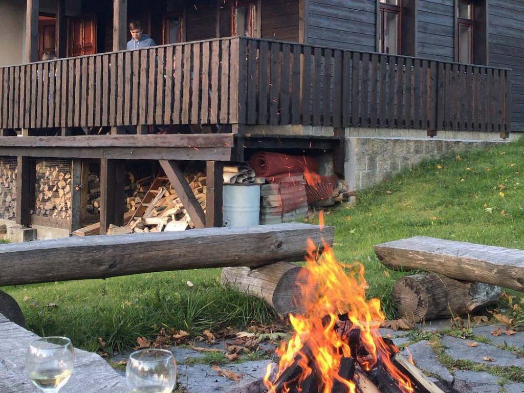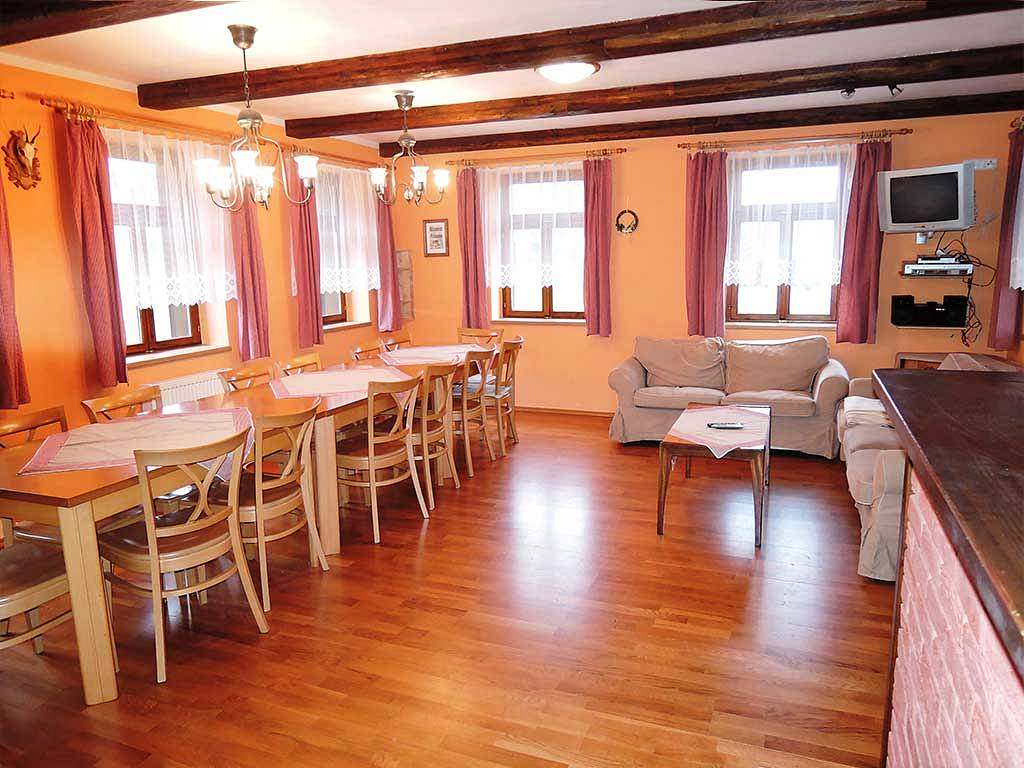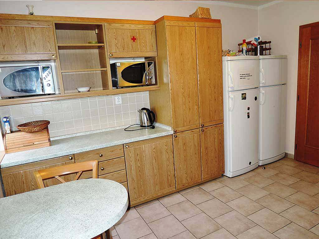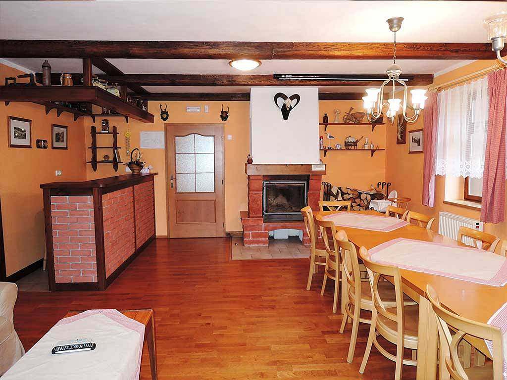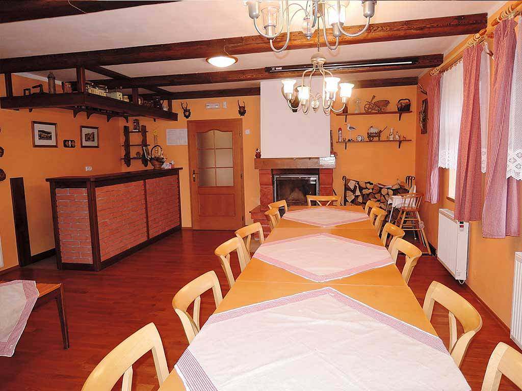 V přízemí se nachází kompletně vybavená kuchyň (dvě mikrovlnné trouby, dva sporáky, trouba i dostatečné množství veškerého nádobí), společenská místnost s barem a krbem (je nutno si zajistit vlastní dřevo), který dodává penzionu rodinnou pohodu.
