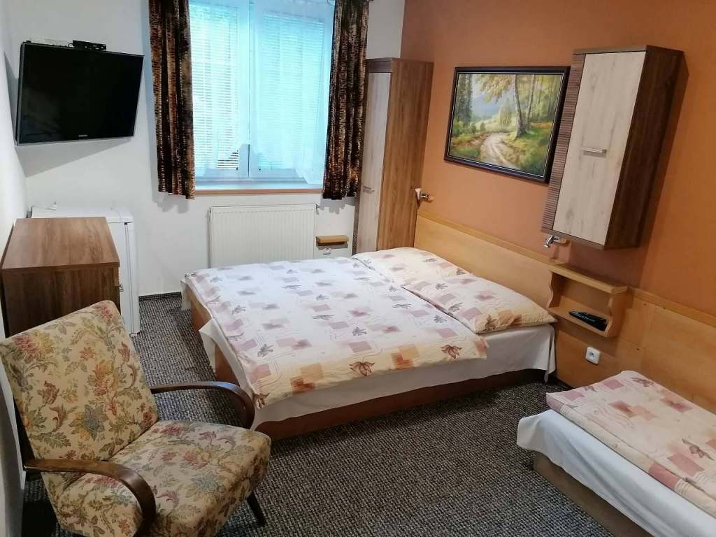 Pokoje v přízemí 2x2L a 2x3L - se soc. zařízením, sprchou, TV, lednicí, stolek a křesla, šatní skříň, wifi, TV. Pro pokoje v přízemí společná jídelna a kuchyň. Přímý vstup na zahradu. Samostatný blok ubytování. Výhled z okna je směrem do zahrady. V oknech žaluzie. Přímý vstup do herny.