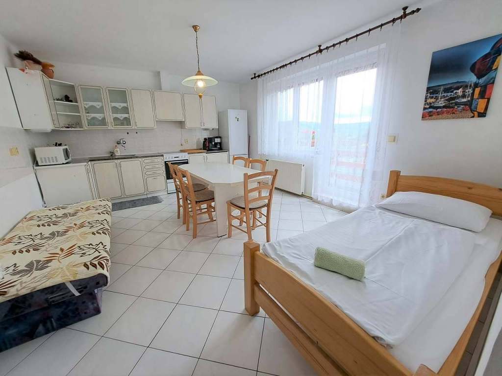 Apartmán, v prvním patře, disponuje plně vybaveným kuchyňským koutem, balkónem s posezením s krásným výhledem. K dispozici je prostor pro uskladnění kol.