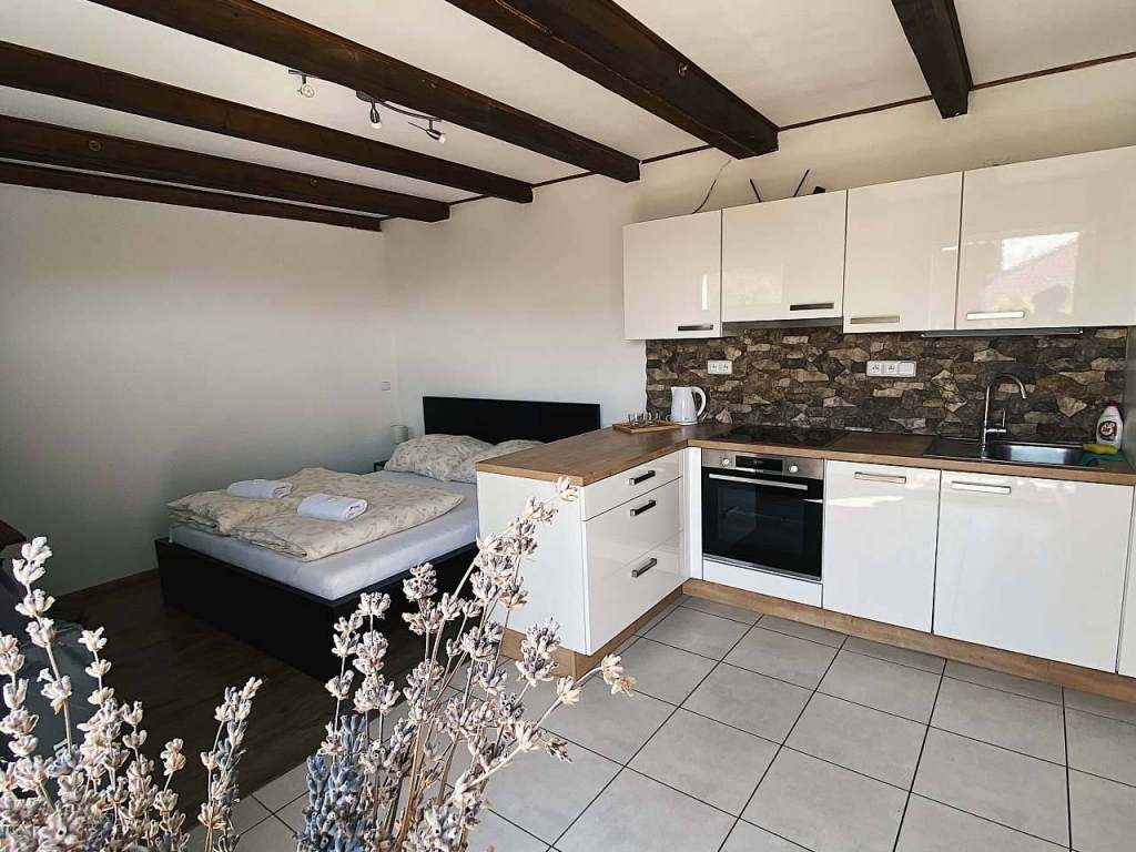 V zahradě se dále nachází dvoulůžkový apartmán s vlastní kuchyní.