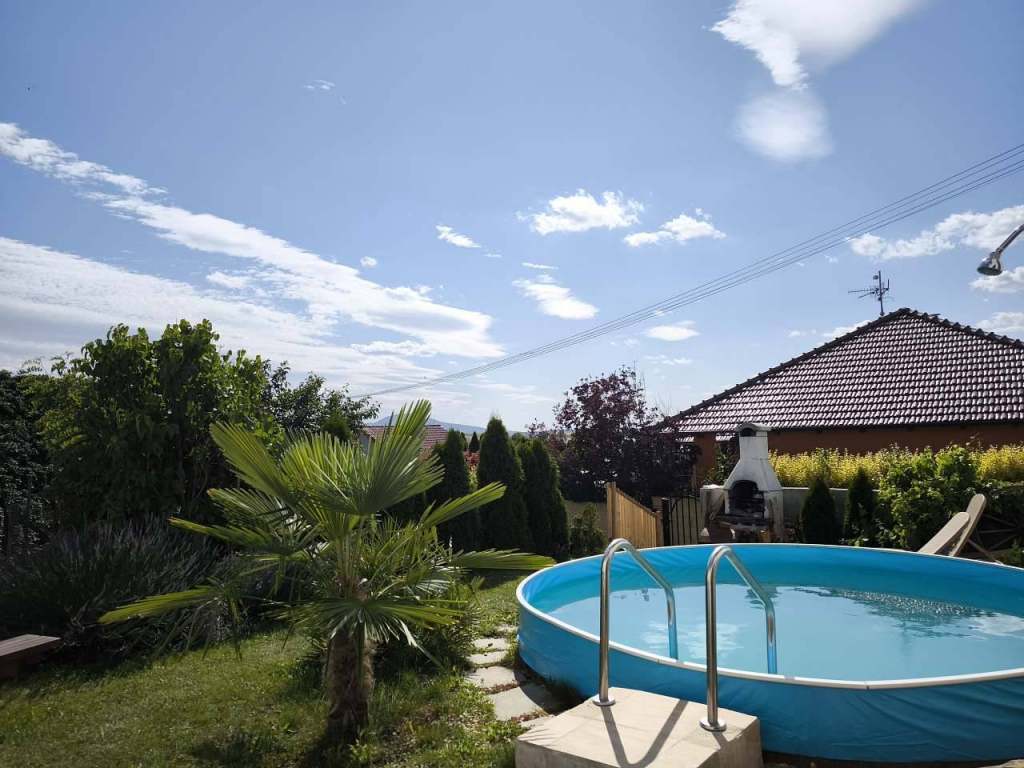 Zahrada s grilem, bazénem a kolárnou.