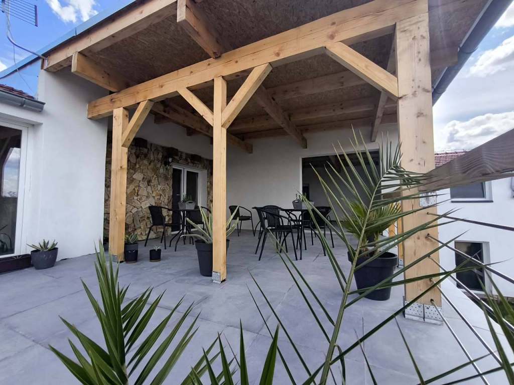 Horní patro v části pensionu se společnou kuchyní, větší terasou s výhledem na Pálavu: 3x dvoulůžkový pokoj Comfort, 1x třílůžkový pokoj Comfort pro celkem až 9 osob. Tento prostor lze uzamknout pro skupiny přátel apod.