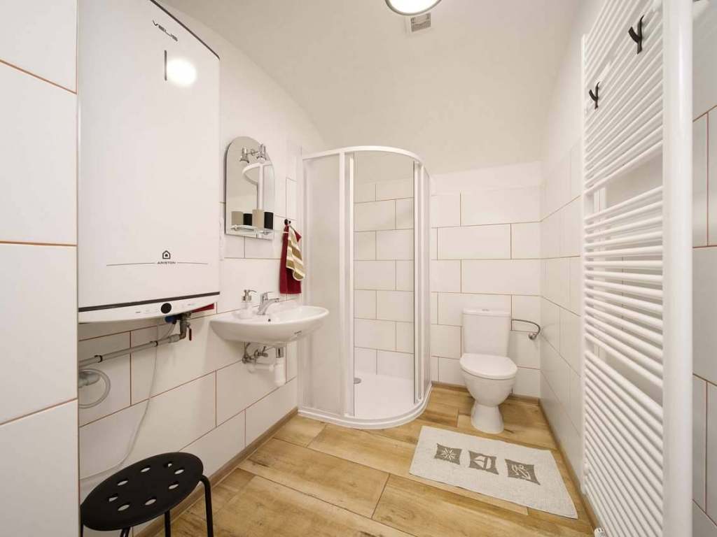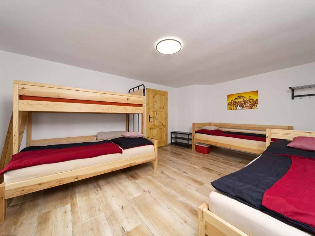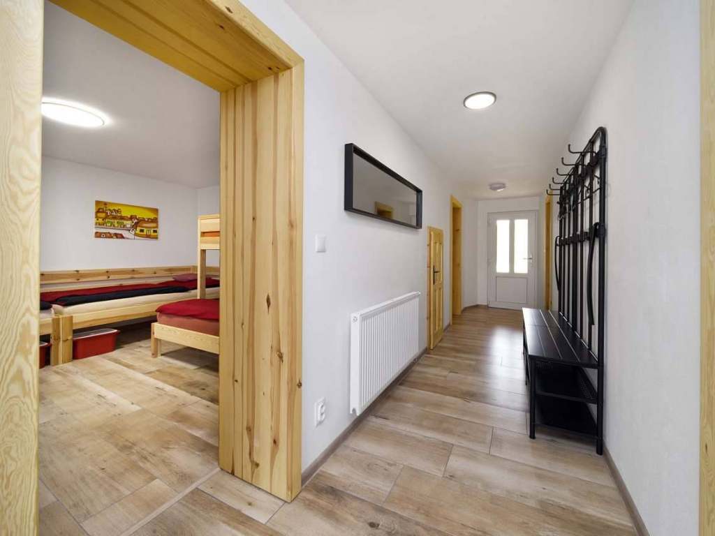 Vstupní chodba s botníky a věšáky. 2 pokoje (3 – 5 lůžkové, dvě oddělená lůžka, palanda 140×200cm, 90×200cm, stůl se židlemi, televize). Každý pokoj má svou koupelnu s WC.