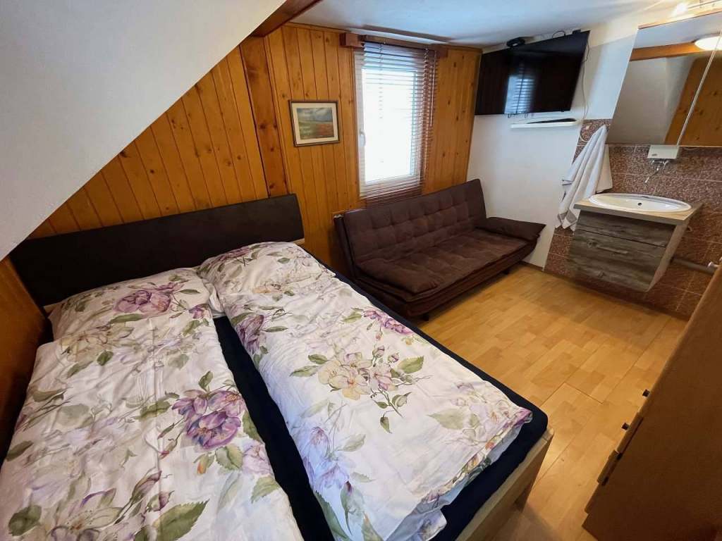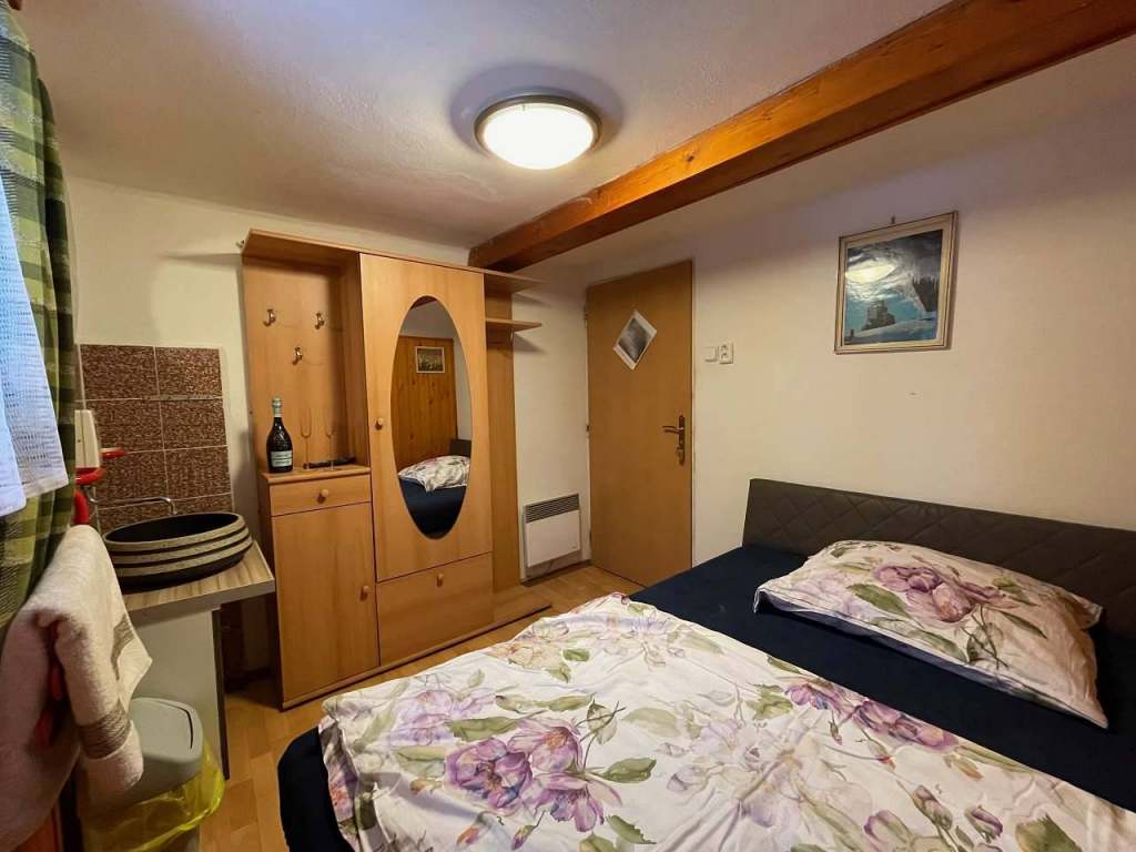 Malý apartmán s jednou manželskou postelí a jednou přistýlkou.