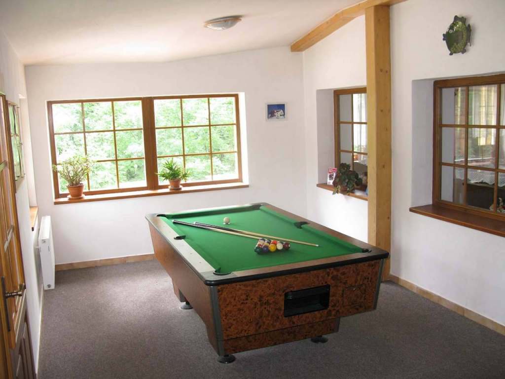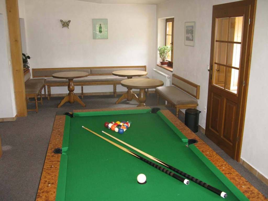 V přízemí společenská místnost s barovým pultem, výčepem a krbem. Další sezení u kulečníku - tři stoly s lavicemi. Stolní fotbal, společné WC s umyvadlem, lyžárna. Pokoje jsou v prvním a druhém poschodí, v šesti z nich kuchyňky vybavené ledničkou, vařičem, rychlovarnou konvicí a veškerým nádobím. Ve dvou lednička, rychlovarná konvice, sklenice a hrnky na nápoje a přípravu kávy a čaje. Ve společných prostorech mikrovlnná trouba. Venkovní stoly a lavice, vyhřívaný venkovní bazén, trampolína, ohniště, gril.