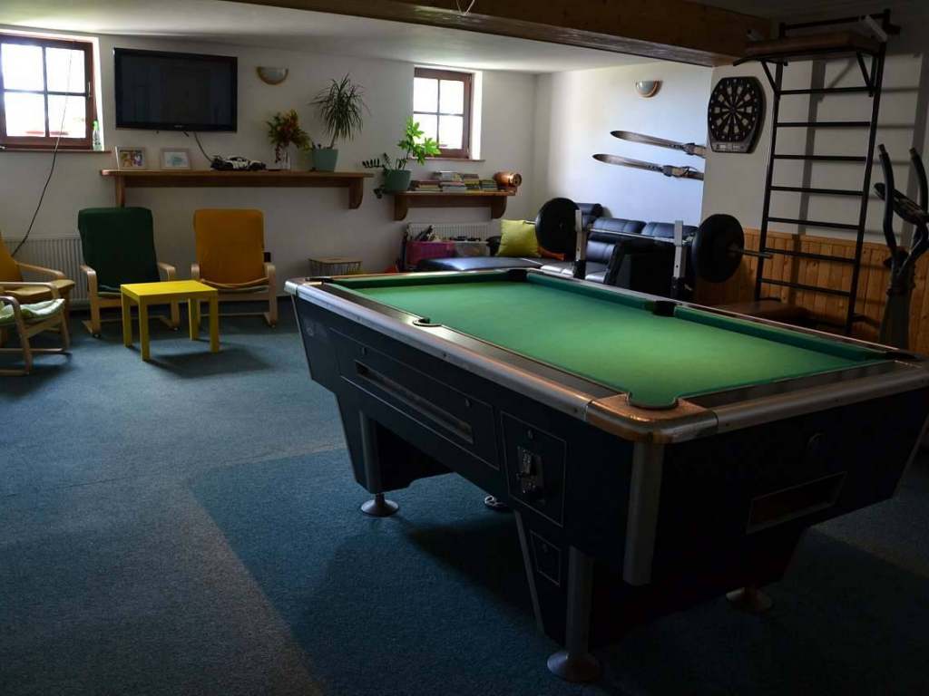 Ve společenské místnosti je kulečník, pingpongový stůl, šipky, hračky pro děti a stolní hry.