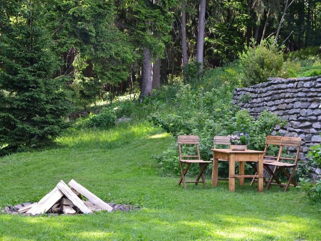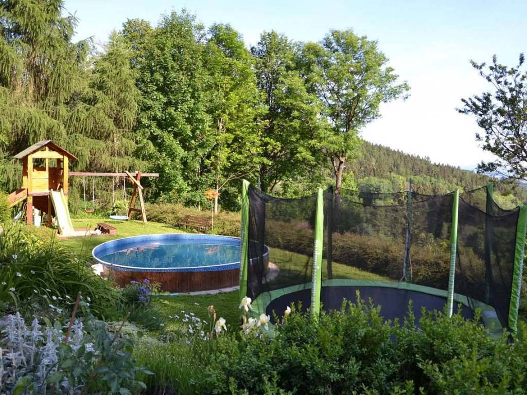 Zahrada a její užitná část je definována stromy a keři, je zde ohniště s posezením, trampolína, dětský koutek