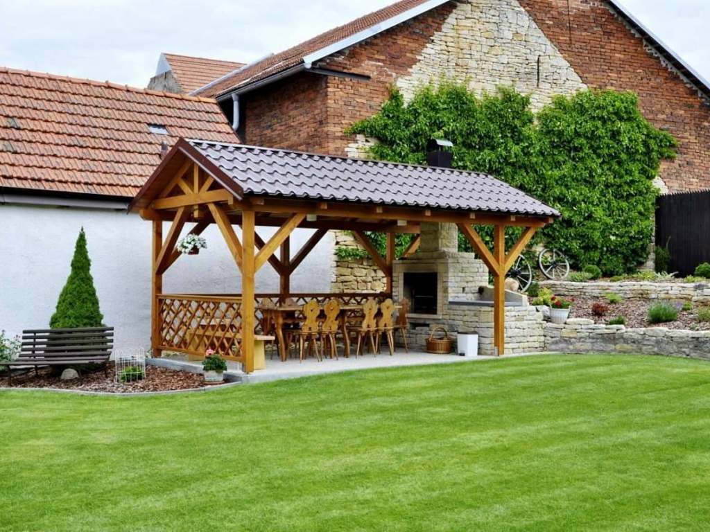 Dále se zde nachází zastřešená pergola s posezením a krbem. Dřevo vozit nemusíte :-), máme ho pro Vás dostatek.