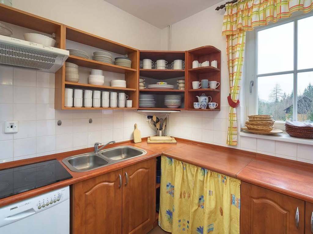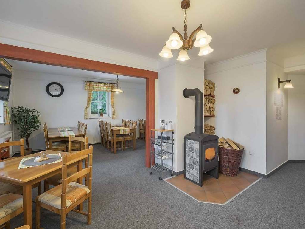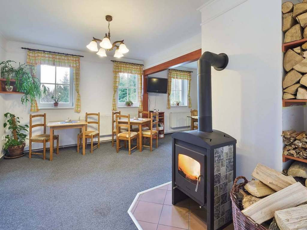 Společenská místnost s krbovými kamny, WiFi free. Udržovaný pozemek u potoka s posezením u ohniště, pískovištěm, houpačkou a vstupem do potoka.