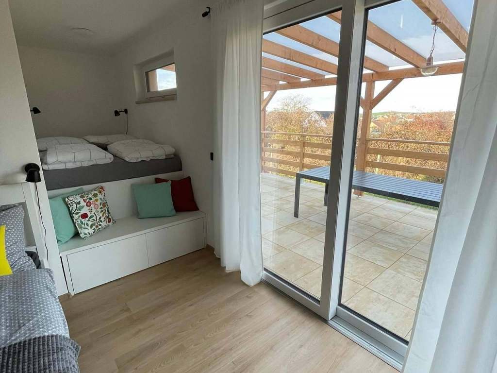 Penzion je dvoupatrový s ubytováním pro 6 osob a vinným sklepem. V přízemí najdete sociální zařízení, plně vybavenou kuchyň (varná deska, myčka, lednice, mikrovlnka, varná konvice, kávovar) včetně prostorné jídelny s TV a vstup do vinného sklípku. V patře jsou pak hostům k dispozici 2 oddělené ložnice se 2 a 4 lůžky, z větší ložnice je přístup na venkovní terasu s posezením a krásným výhledem do krajiny.