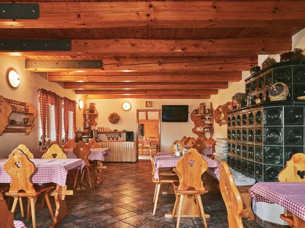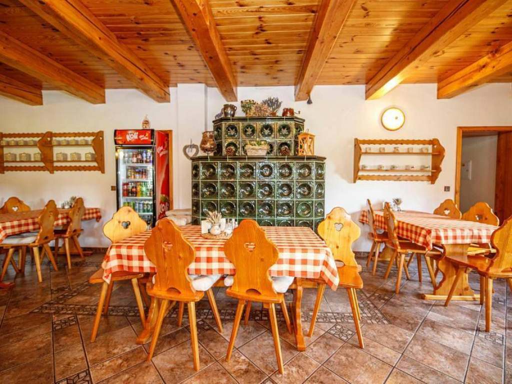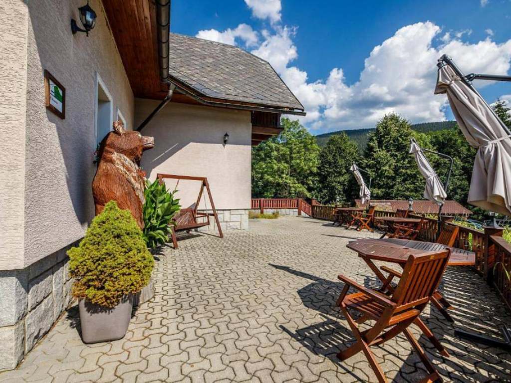 Na penzionu je velká společenská místnost s kachlovými kamny, společnou kuchyní a posezením. Dětská herna pro malé děti a herna se stolním tenisem a fotbálkem. Lyžárna/ kolárna a sušák na boty. Příjemné posezení na venkovní zastřešené terase s grilem a velká zahrada s ohništěm. Relaxovat můžete také na lehátkách a osvěžit se ve vyhřívaném venkovním bazénu se slanou vodou. Pro děti je připravené dětské hřiště s houpačkami, průlezkami, skluzavkou, kolotočem a pískoviště.