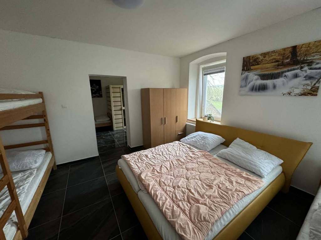 V patře domu v pravém křídle se nachází pokoje č. 1..... manželská postel+patrová postel. pokoj č. 2.... manželská postel +patrová postel.... pokoj č. 3,.... manželská postel +patrová postel, prostorná koupelna +WC. V levém křídle se nachází pokoj č. 4... manželská postel +patrová postel+postýlka. pokoj č5... je největším pokojem v celém domě má 2x patrovou postel +1x manželská postel+1postel. pokoj č. 6 má jen jedno lůžko s infrasaunou. Další samostatná koupelnou + 1x WC... Celková kapacita domu je 13 lůžek + 2xpostýlka +6patrových postelí.