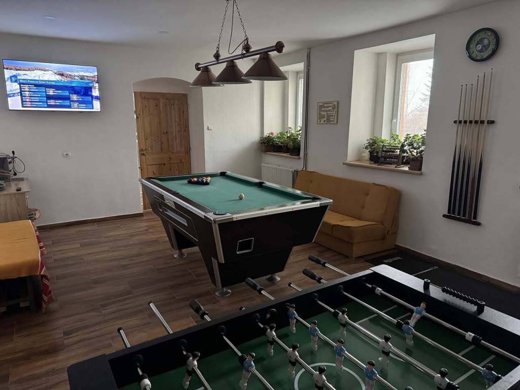 Kulečník, elektronické šipky, výčep, 2x televize, stolní fotbal, trampolína, pingpongový stůl, nafukovací venkovní hrad, dětské hřiště, PS3 konzole, hřiště na fotbal.