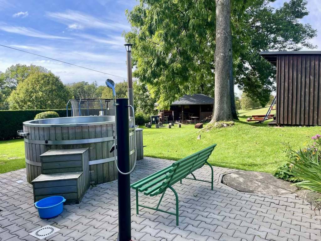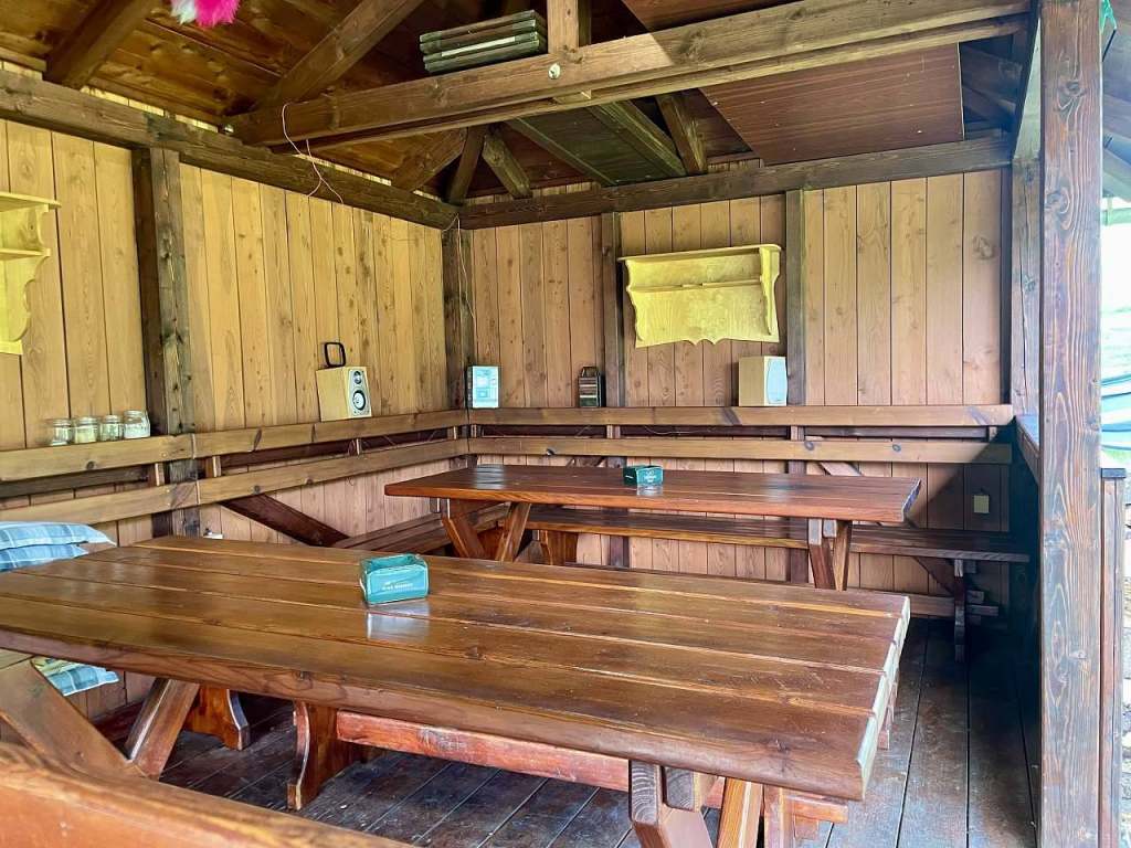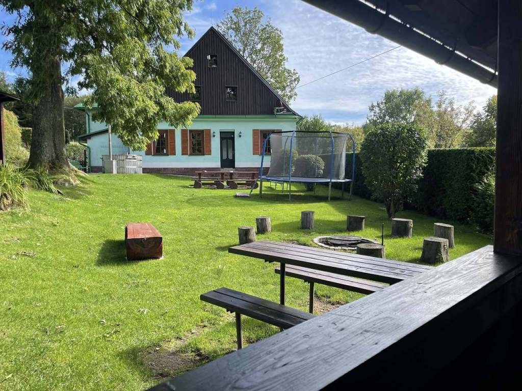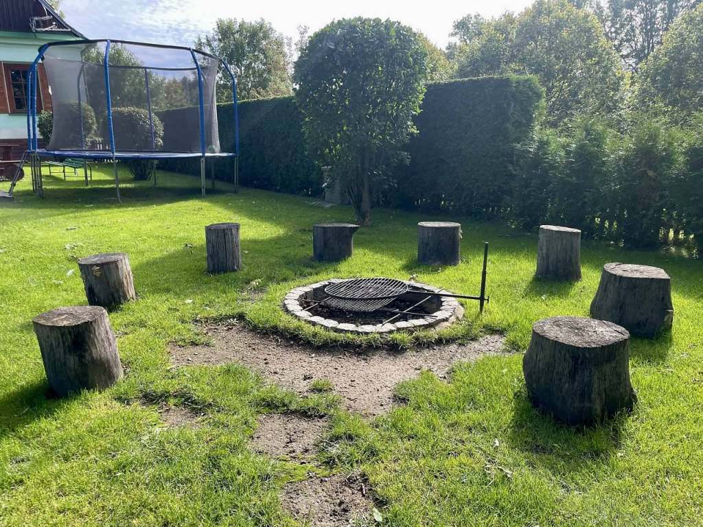 Venkovní ohniště s grilem a krytím i volním sezením cca. pro 35 hostí. Zahradní křesla, lavice, lavičky a stoly. Pískoviště, houpačky a velká trampolína.