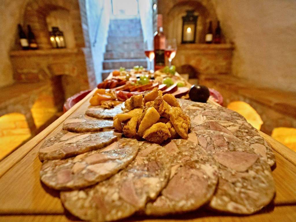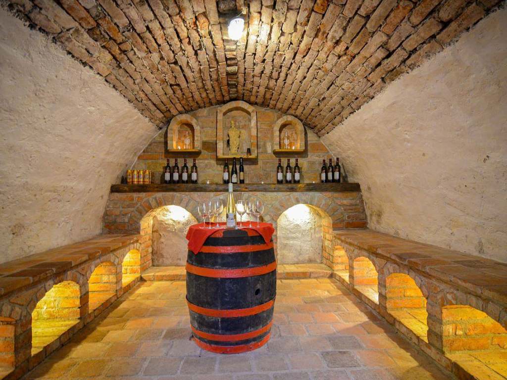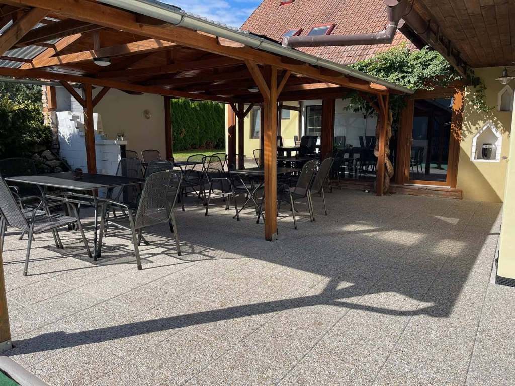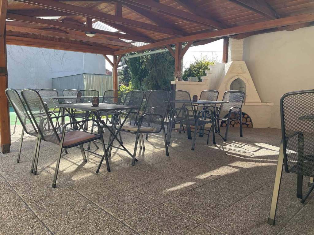 Terasa s posezením, krbem a grilem, vinným sklípkem.