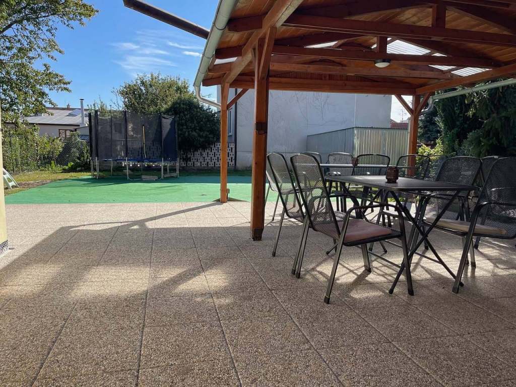 Prostorná zahrada s houpačkou a pískovištěm, v létě s bazénem a lehátky.