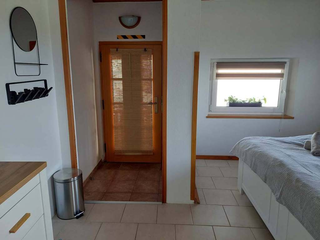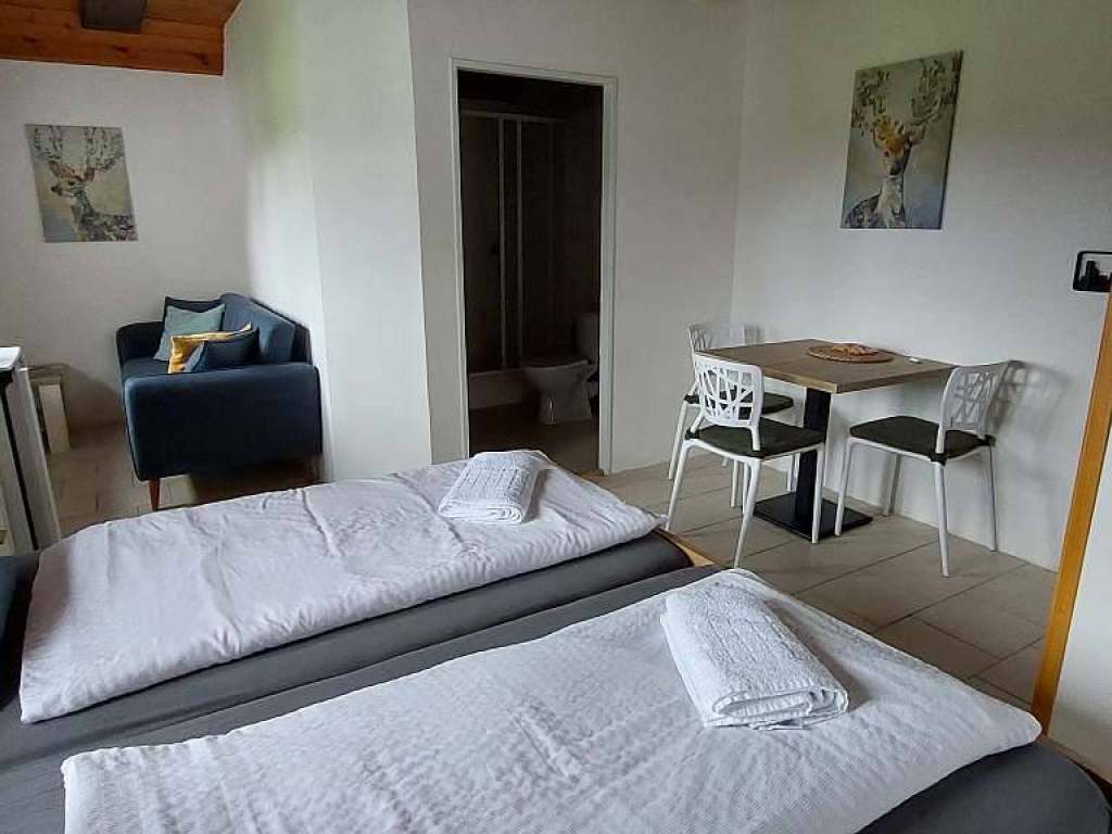 4.Bezbariérový apartmán 2+3 (přízemní apartmán s pevným a rozkládacím dvoulůžkem), jídelní kout, samostatná obytná kuchyně s rozkládací pohovkou, koupelna s vanou a WC.