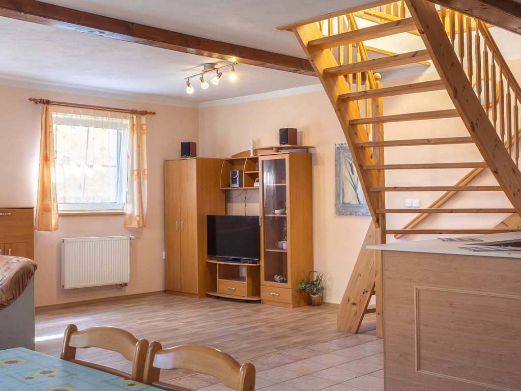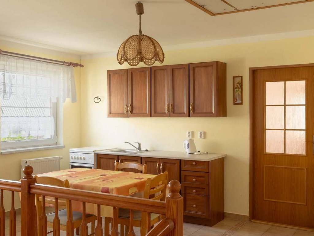 v 1.patře pak jeden třílůžkový pokoj, jeden dvoulůžkový s koupelnou se sprchovým koutem a WC, a 1 třílůžkový také s koupelnou se sprchovým koutem a WC. Je zde vybavená kuchyně.