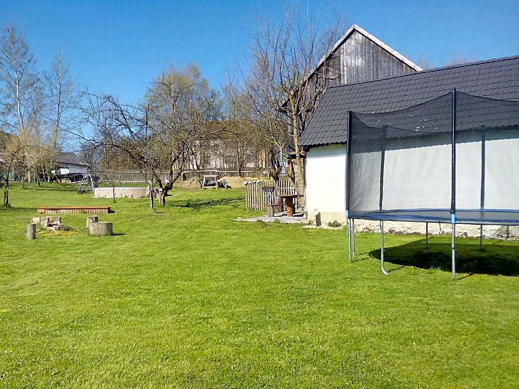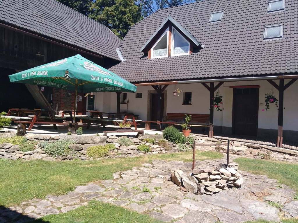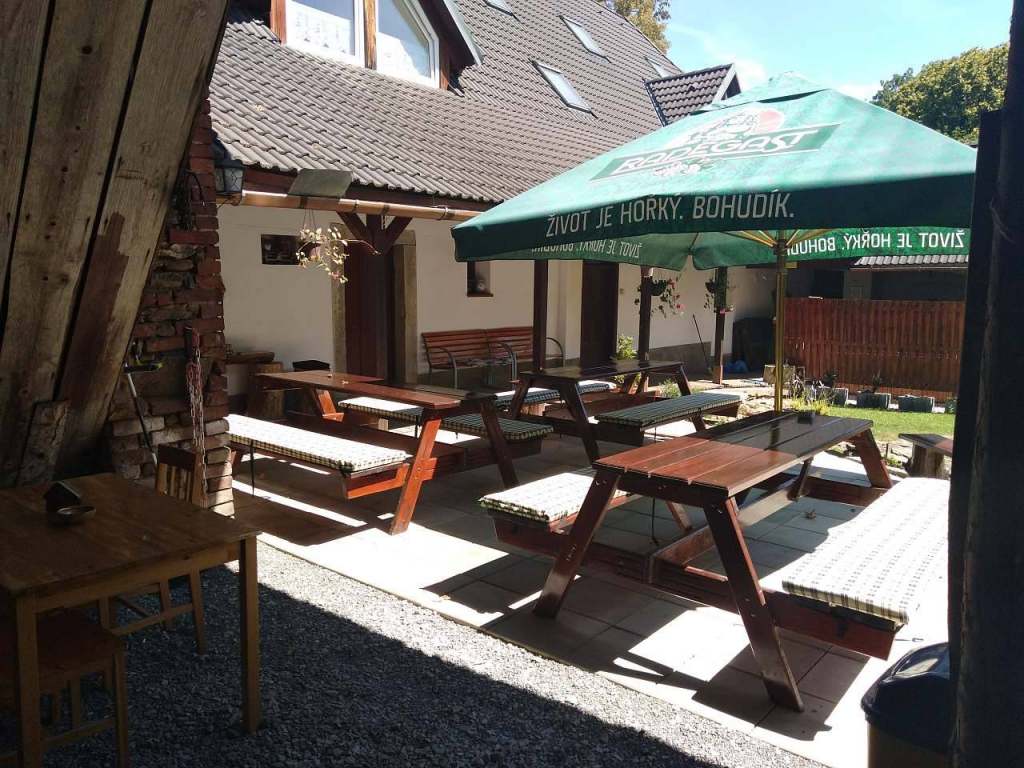 Samostatně stojící stavení z 18.století citlivě přebudované na zařízení splňující dnešní požadavky. Půdorys tvoří čtverec, když jedna část je ubytování, hospůdka, druhá zahrnuje relaxační část (infrasauna, venkovní vířivka) a uzamykatelnou část pro kola, nebo lyže (elektronicky střeženo). Pod další zakrytou částí k dispozici stolní tenis a prostor pro další hry v případě nepříznivého počasí. PRO ROK 2026 venkovní společná kuchyně pro skupinové pobyty. Vnitřek čtverce pak vyplňuje příjemné venkovní posezení s lavicemi a slunečníkem včetně otevřeného ohniště, které lze využít k opékání, nebo grilování. Vnější část objektu tvoří rozlehlá oplocená zahrada, kde dominuje jezírko s vnitřním vyhřívaným bazénem 6x3 m (hloubka 120 cm). K dispozici zahradní sprcha, lehátka a další posezení s druhým ohništěm a dětský kruhový bazén (průměr 4,3 m a hloubka 0,9 m). V bezprostřední blízkosti zahrady (50m) dětské hřiště, volejbalové hřiště, hřiště na nohejbal a amatérské fotbalové hřiště. Ideální pro party přátel - pronájem celé chalupy v sezoně již od 420,- Kč/os/den (týdenní pobyt, pronájem celé ubytovací kapacity).