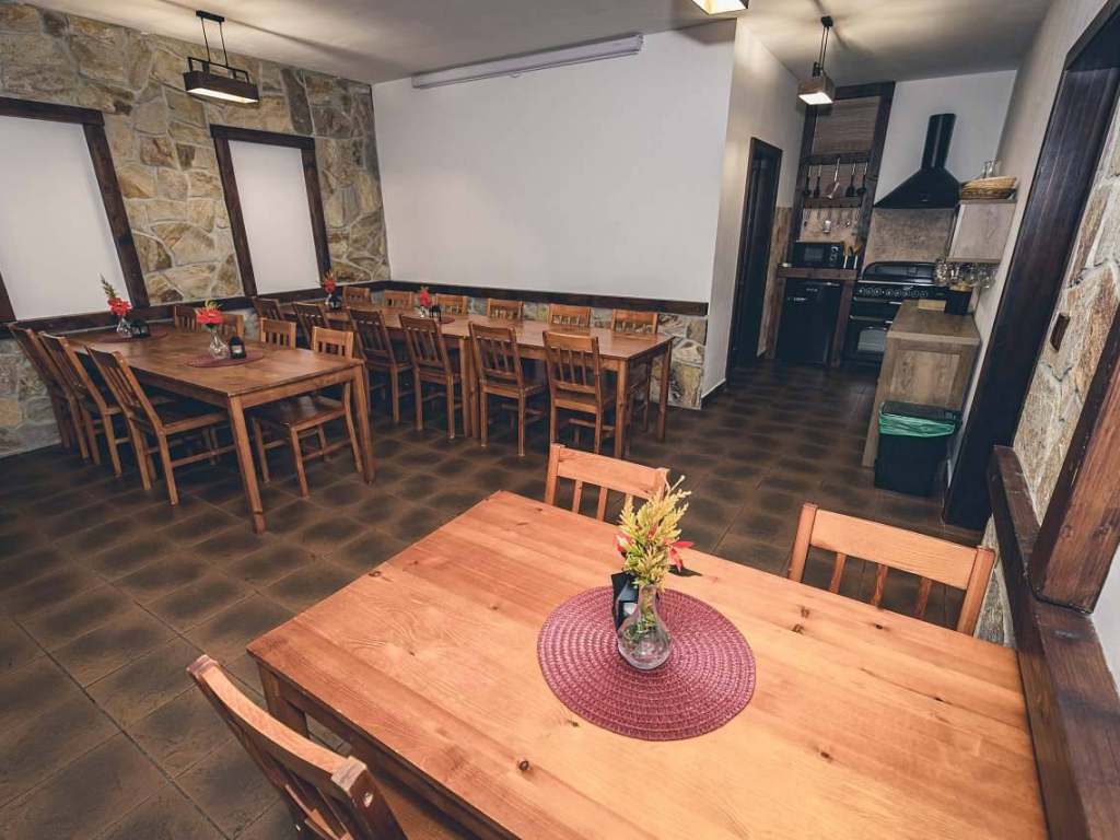 Společenská místnost s kuchyní + dvě obrovské terasy, směren na jih posezení pro 24 osob, dva slunečníky, na západ houpačka, lavice, dva barové stoly.