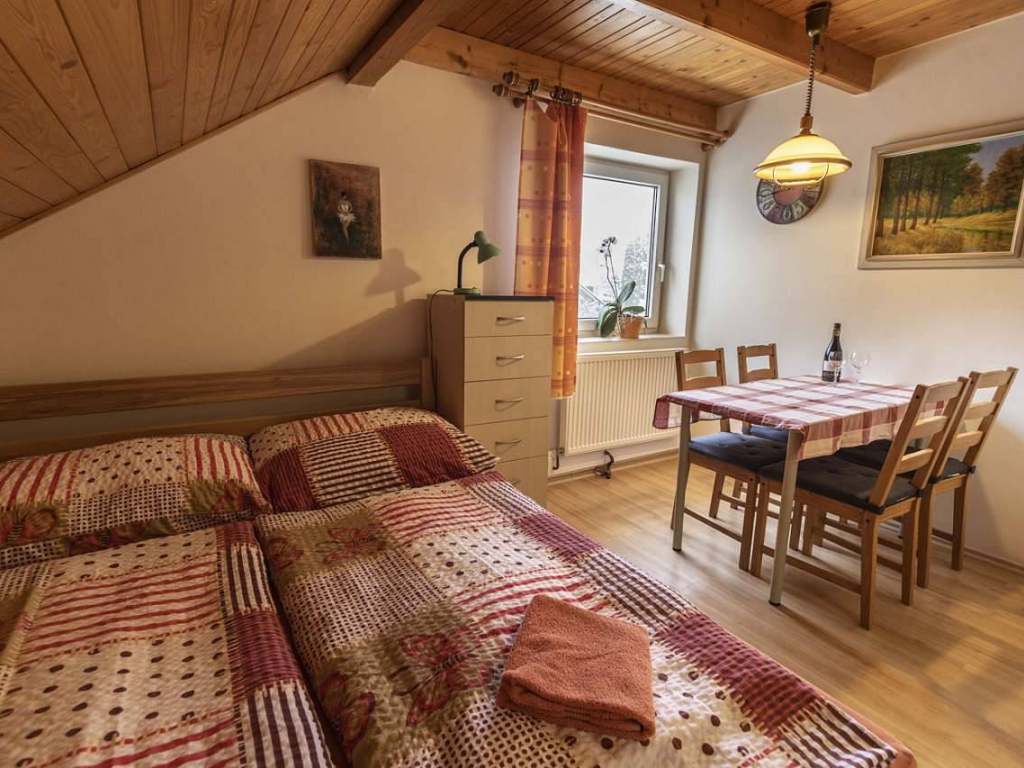 Apartmán č. 1 je čtyřlůžkový pokoj s vlastní koupelnou, kuchyňským a jídelním koutem.