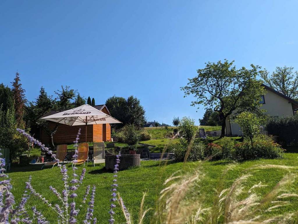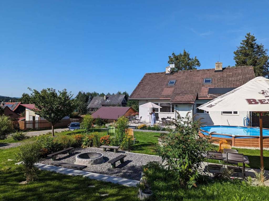 U objektu je oplocená zahrada, terasa, gril, ohniště, trampolína, skluzavka, houpačky, pískoviště, bazén 5,5m/1,2m.