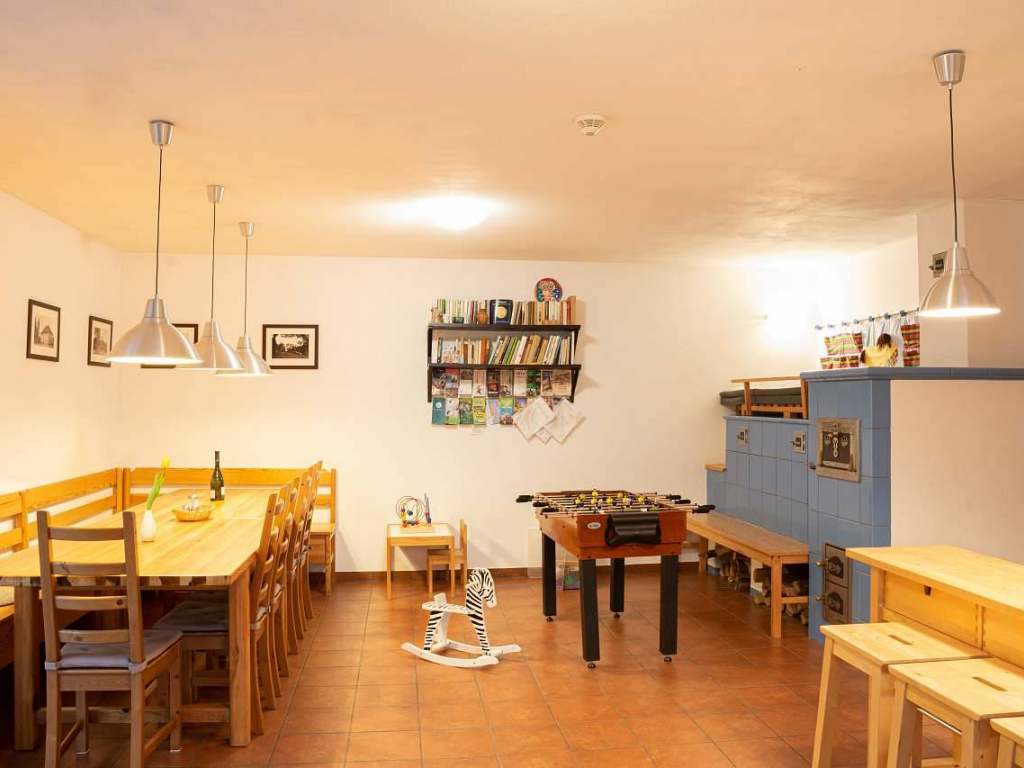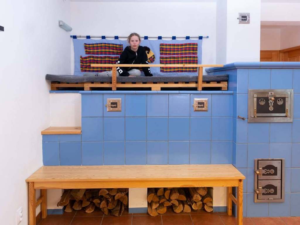 V přízemí penzionu v západní části budovy je hostům k dispozici prostorná společenská místnost s kuchyňským koutem a s klasickou kachlovou pecí s ložnou plochou nejen pro lenochy. Pec je sice z roku 2011,ale je vystavena z klasických kachlů a spojována kamnářským jílem. V babce pece je nerezová trouba, ve které je možné péct. Ložná plocha je pochopitelně vyhřívaná. Po zaškolení mohou klienti v peci sami topit, pokud ovšem nehrozí přehřátí místnosti (např. v letních vedrech). Kuchyňský kout je plně vybaven vším potřebným i pro ty nejnáročnější strávníky a větší skupiny. Součástí kuchyňské linky je prostorná lednice s mrazákem. Společenská místnost má dvě francouzská okna, jedno je situováno na jih do dvora, druhé na západ s krásným výhledem na zahradu a hlavně na dětské hřiště, takže rodiče budou mít děti vždy pod kontrolou. Současně lze tímto oknem vstoupit na terasu s dřevěným posezením a s markýzou.