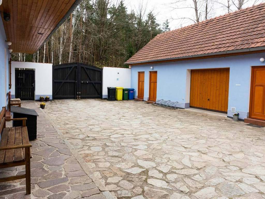 Dvůr, zahrada a okolí - Celý areál má rozlohu přes 6000 m2 a sahá od příjezdové cesty až po přírodní památku Kozí vršek. Nejoblíbenější je naše velké dětské hřiště ve tvaru vláčku, trampolína a hlavně pravé mechanické železniční závory, které jsou plně funkční a pan domácí rád umožní dětem i dospělým si s nimi pohrát. Na pozemku se rozprostírá louka, jehličnatý les, malý ovocný sad, příjezdová cesta, předzahrádka, sklípek na potraviny (od roku 2014), terasa, obytná budova a hospodářská budova, mezi nimiž je uzavřený dvůr. V hospodářské části stavení je hostům k dispozici kolárna, ve které jsou stojany na kola s možností zavěšení či zasunutí kol, celková kapacita je 20 kol. Nechybí plácek na gril a ohniště.