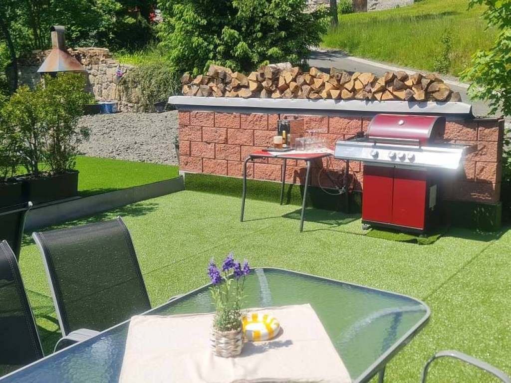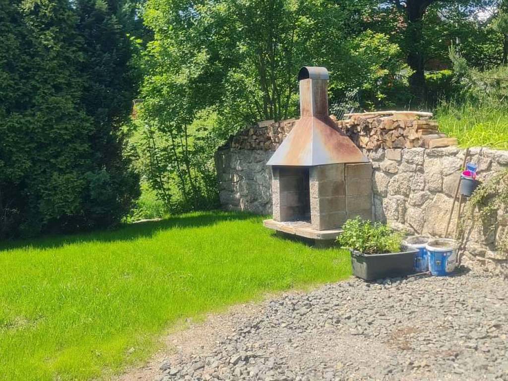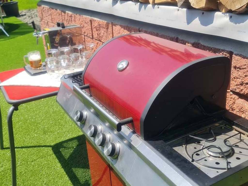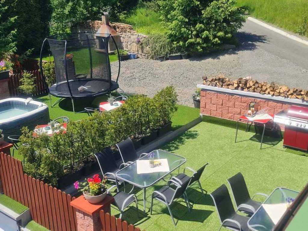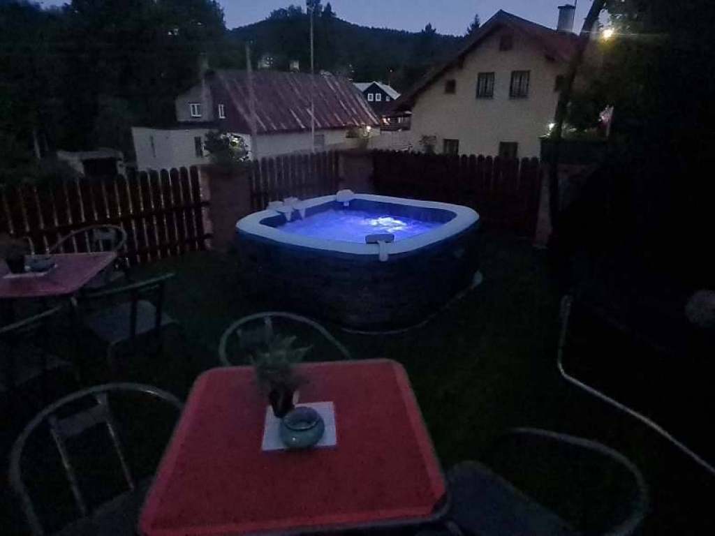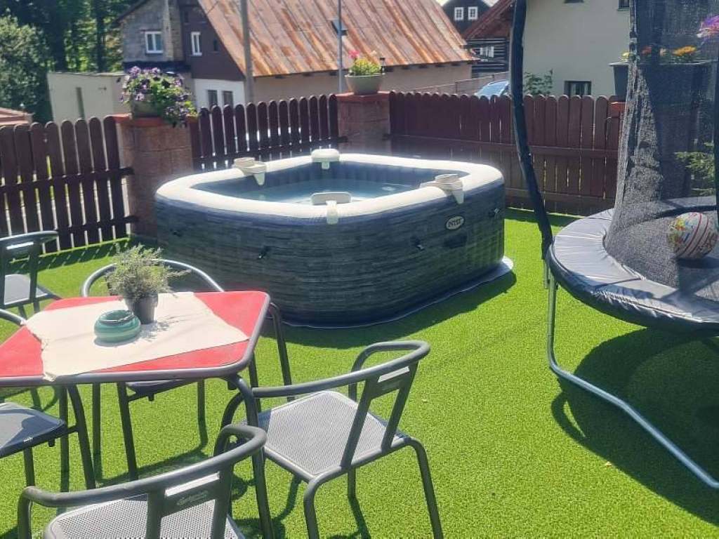 Posezení na venkovní terase s whirpoolem, dětskou trampolínou, venkovním krbem, možnost zapůjčení výčepního zařízení a dovoz piva. K dispozici též plynový gril
