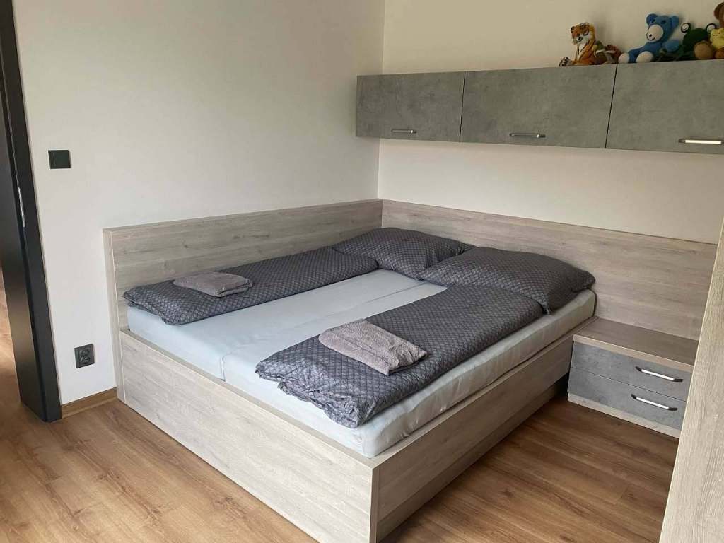 V oddělené ložnici se pohodlně vyspíte na 5 plnohodnotných postelích, z toho dvě lůžka jsou na vyvýšeném pódiu. Pod pódiem se nachází další samostatná postel. Dále se v ložnici nachází manželská postel. Z ložnice je přímý východ na soukromou zahradu. V obývacím pokoji se nachází pohodlný rozkládací gauč, který může sloužit jako nouzové lůžko, my ho ale využíváme jako prostor k relaxaci a sledování TV pro celou rodinu. Obývací pokoj je spojený s kuchyňským koutem a jídelnou a nabízí propojení se zahradou.