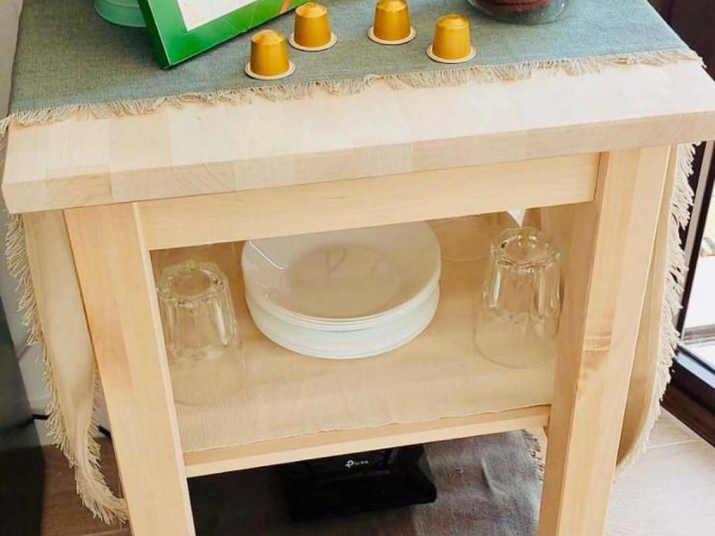 Obývací pokoj s kuchyňským koutem: Otevřený, světlý prostor s pohovkou, jídelním stolem a plně vybaveným kuchyňským koutem (lednice, varná deska, mikrovlnná trouba, kávovar, pračka, základní kuchyňské vybavení). Terasa / balkon: Soukromá terasa s posezením a výhledem na bazénový komplex, vhodná k relaxaci.