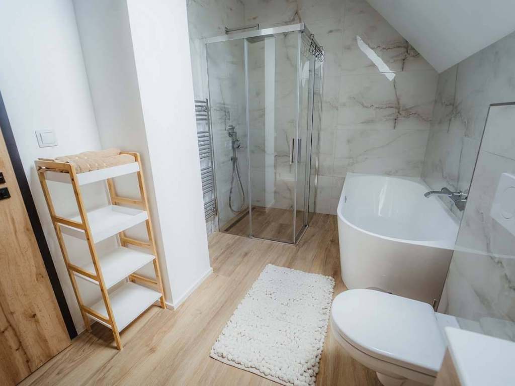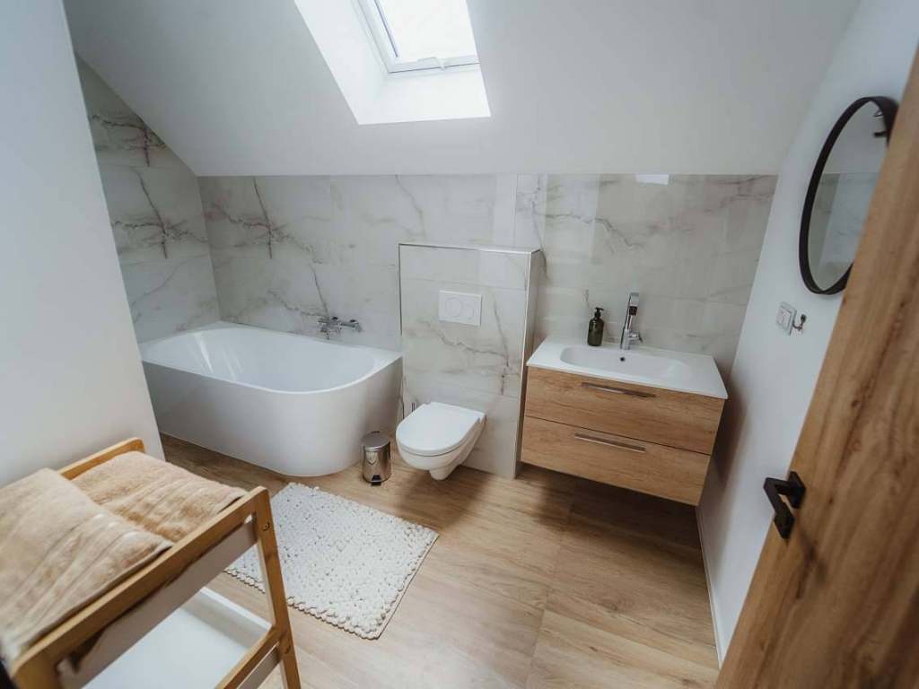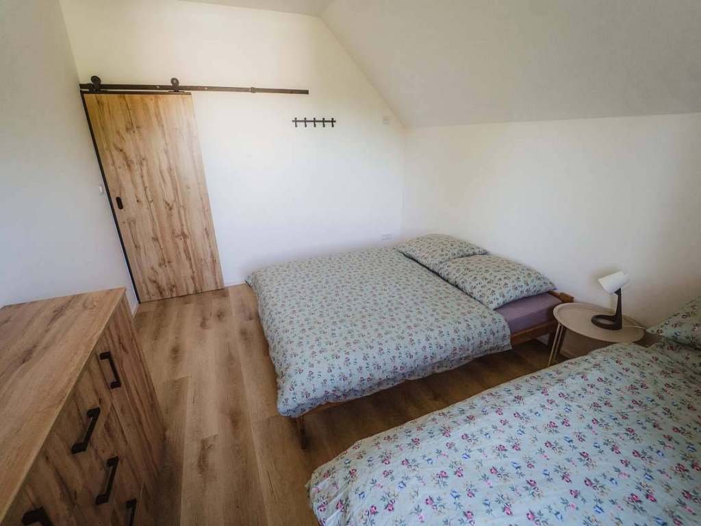 Apartmán v podkroví: až pro 8 osob ve 2 pokojích s dvoulůžkem a dvěma jednolůžky (plus rozkládací pohovka v obývacím pokoji), komoda v pokoji, druhá komoda v obývacím pokoji. Plně vybavená kuchyně s velkým jídelním stolem, obývací pokoj s rozkládací pohovkou, koupelna se sprchovým koutem a vanou, 2x WC, Wi - Fi, smart TV, fén, ložní prádlo, ručníky.