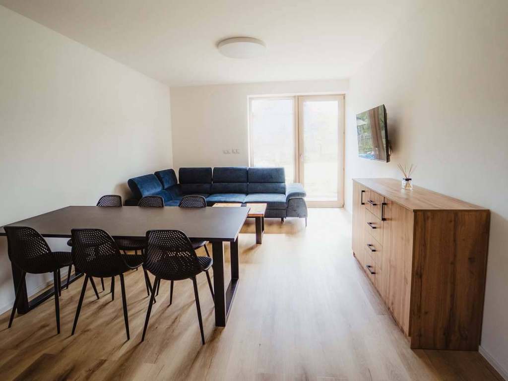 Apartmán v přízemí až pro 8 osob ve 2 pokojích s dvoulůžkem a dvěma jednolůžky (plus rozkládací pohovka v obývacím pokoji), komoda v pokoji, skříň na chodbě, druhá komoda v obývacím pokoji. Plně vybavená kuchyně a velkým jídelním stolem, obývací pokoj s rozkládací pohovkou, koupelna se sprchovým koutem, 2x WC, Wi - Fi, smart TV, fén, ložní prádlo, ručníky.