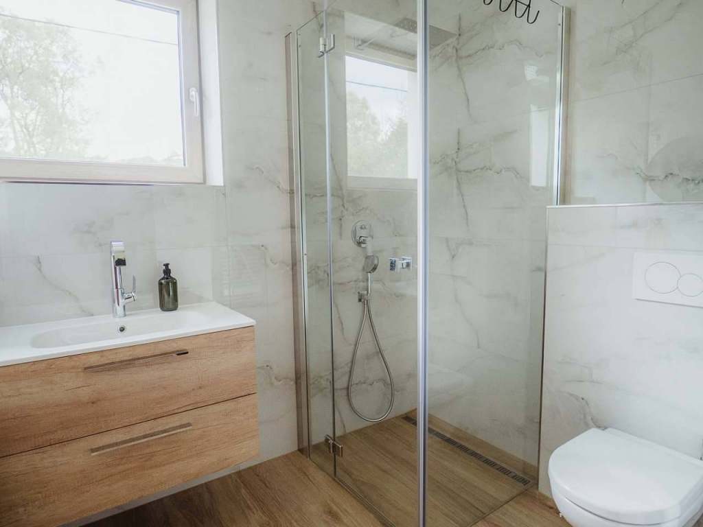 Společné prostory: pračka, prostor pod schodištěm k umístění lyží a dalšího sportovního vybavení, venkovní prostory jsou společné pro oba apartmány: krytá terasa, zahrada s plynovým grilem, dále pro spokojený pobyt koupací vyhřívaný sud pro 8 - 10 osob, sauna pro 6 osob.