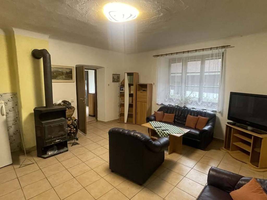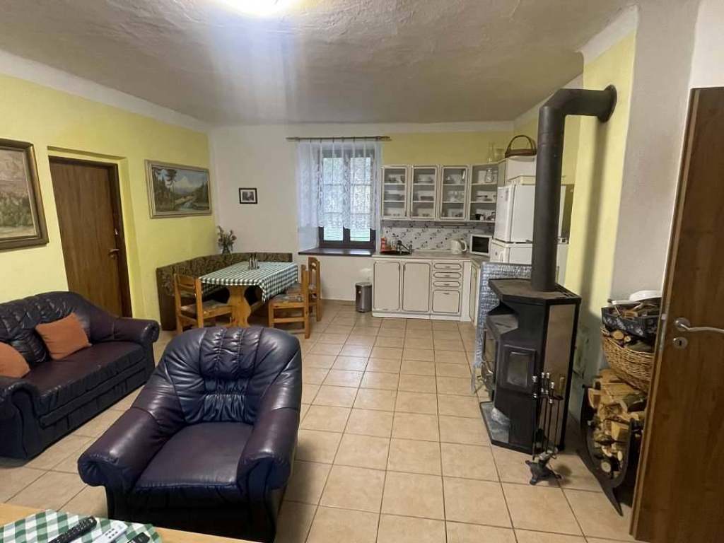 obývací místnost se sedací soupravou se dvěma lůžky, skříňky, TV, jídelní kout a krbová kamna, kuchyňský kout, pračka, koupelna společná s WC (sprchový kout).