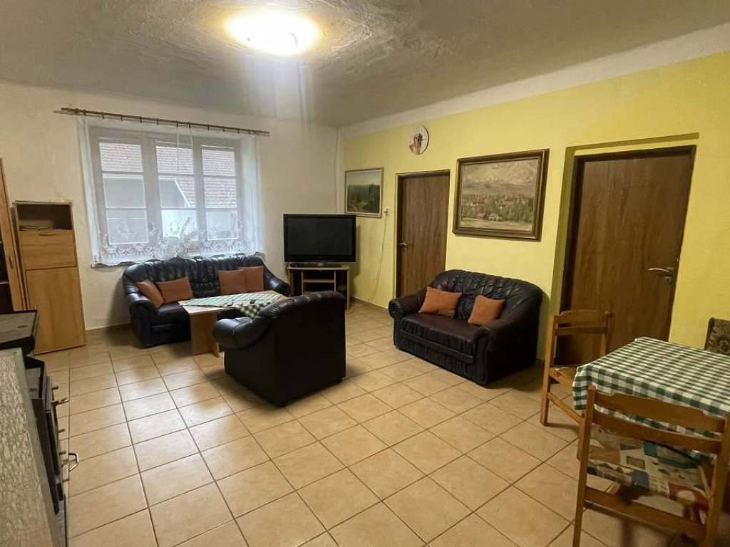 obývací pokoj: společný s kuchyňským koutem a jídelnou, sedací souprava, TV, krbová kamna, samostatná koupelna (sprchový kout, umyvadlo, pračka), WC