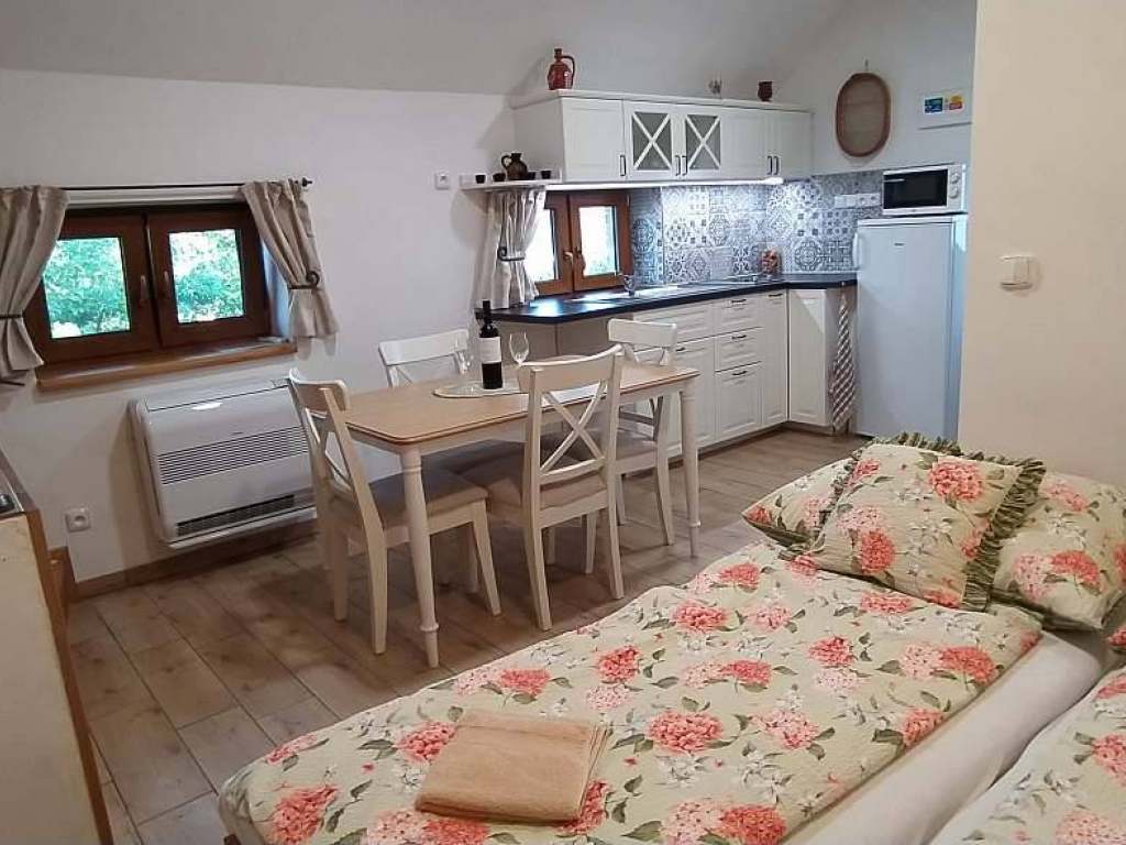 Apartmán Stáj: plně vybavená kuchyň s lednicí, mikrovlnkou, varnou indukční deskou, varnou konvicí, jídelním stolem, 180 cm širokým dvojlůžkem. Apartmán je v přízemí na úrovni zahrady.