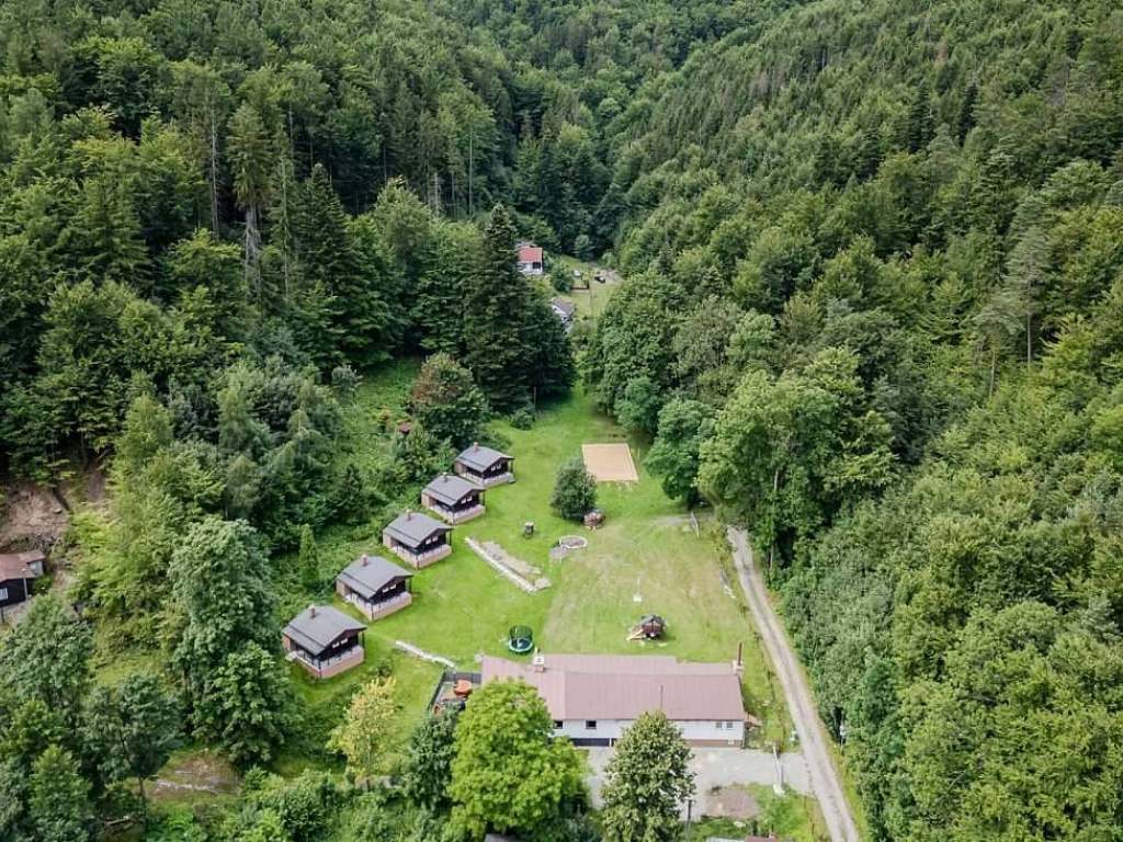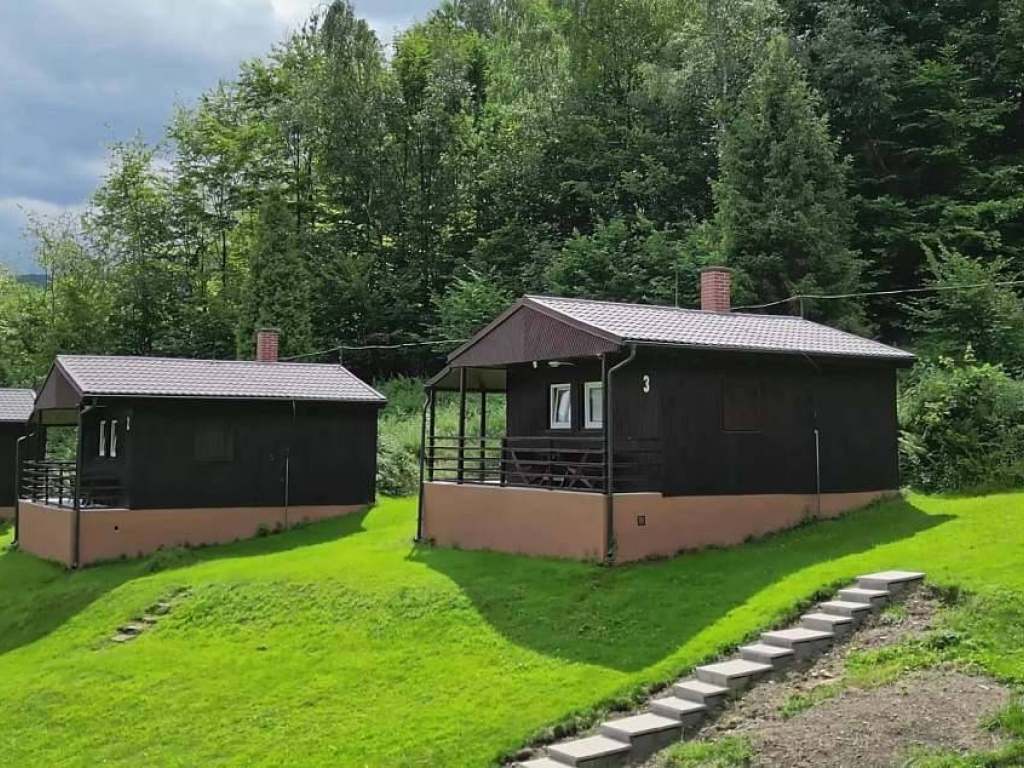 5x Modernizovaná chatka: Každá chatka má vlastní terasu pro ranní kávu, vybavený kuchyňský kout, WC, 4 pevná lůžka a 1 rozkládací gauč.