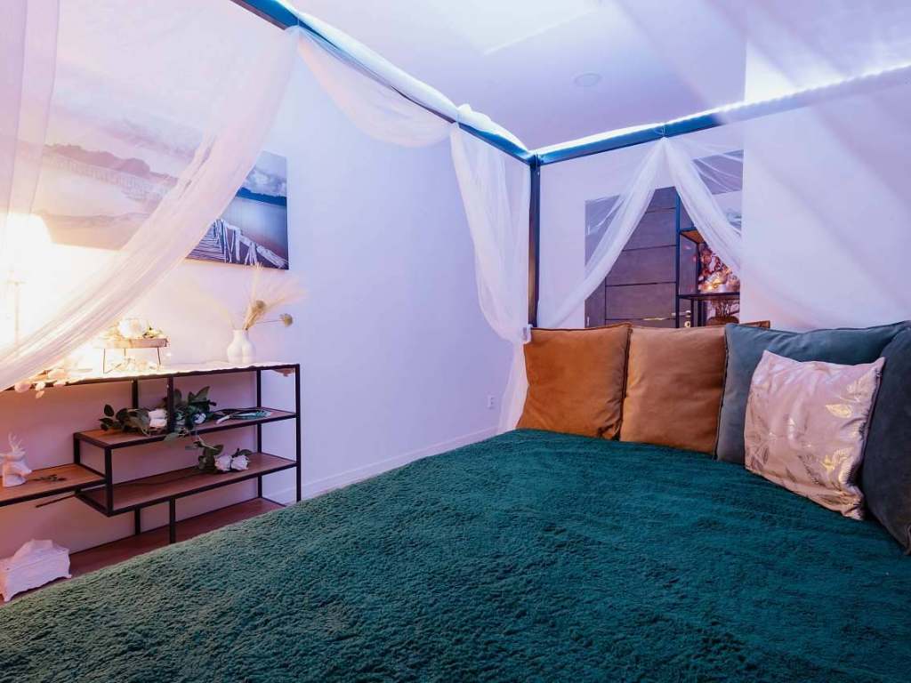 V přízemí také najdeme wellness jehož součástí je sauna pokoj a v druhém pokoji, klasická manželská postel s nebesy kuchyň, WC + sprcha se vstupem na terasu.
