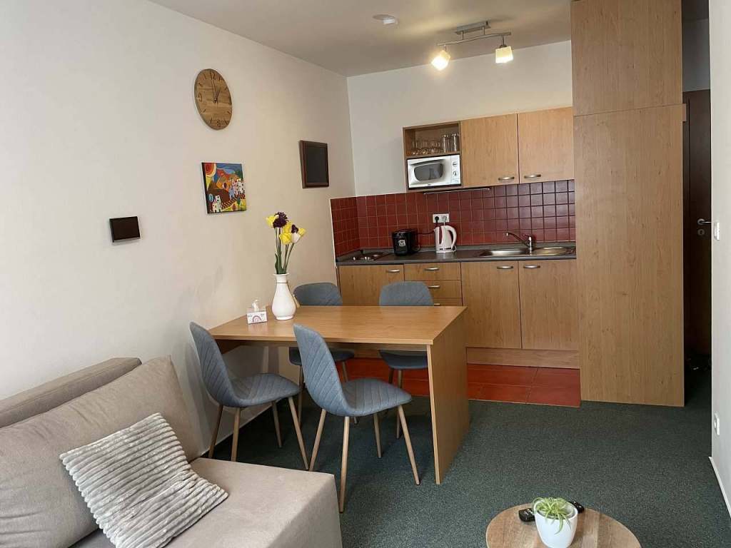 Apartmán PalacKY: vlastní vybavený kuchyňský kout (dřez, vařič, mikrovlnná trouba, varná konvice, malá lednice s vloženým mrazákem).