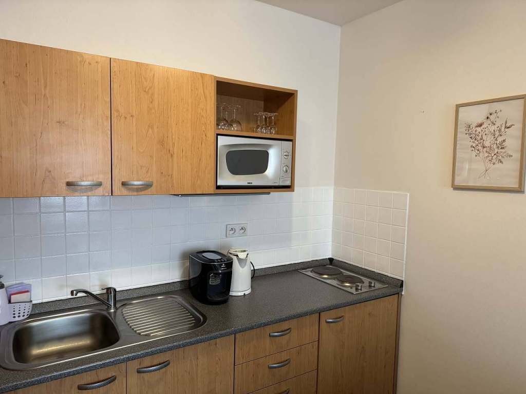 Apartmán KiRi 1: vlastní vybavený kuchyňský kout (dřez, vařič, mikrovlnná trouba, varná konvice, malá lednice s vloženým mrazákem, kávovar na kapsle Tchibo).