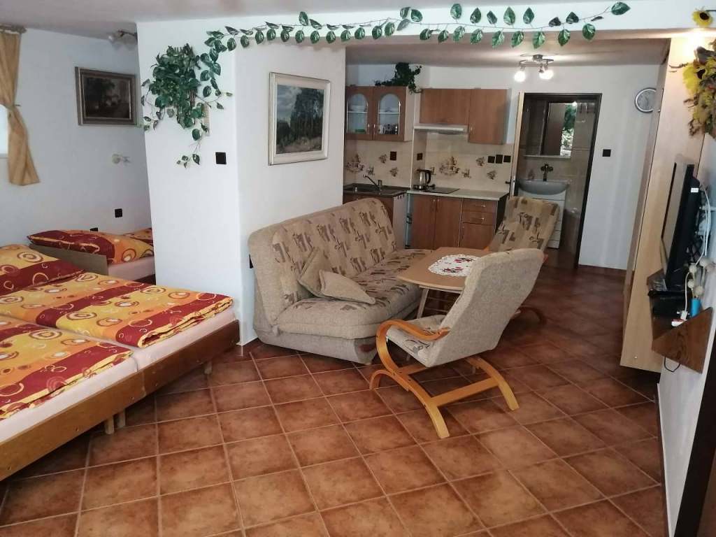 K dispozici budete mít 2 apartmány dohromady s 8 lůžky, které je možné vzájemně propojit, internet, 2 sprchy a toalety, 2 kuchyňky, 2 televize a celou zahradu. Oba apartmány jsou vhodné pro 3 - členné rodinky, případně lze oba apartmány vzájemně propojit nebo upravit na 4 lůžka a 2 lůžka. Každý z apartmánů má vlastní kuchyňku a koupelnu s toaletou.