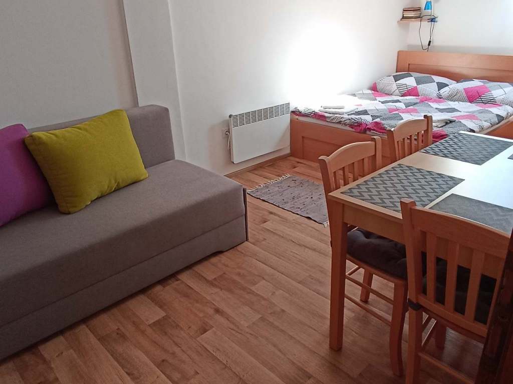 Horní pokoj je celkem pro 4 osoby. Zde je manželská postel a rozkládací pohovka pro 2 osoby. Pokoj je vybaven kuchyňským koutem, vlastním vchodem a vlastním sociálním zařízením. K dispozici zdarma máte povlečení, ručníky, veškeré toaletní potřeby, kávu, čaj, fén... Wifi je v celém objektu zdarma.