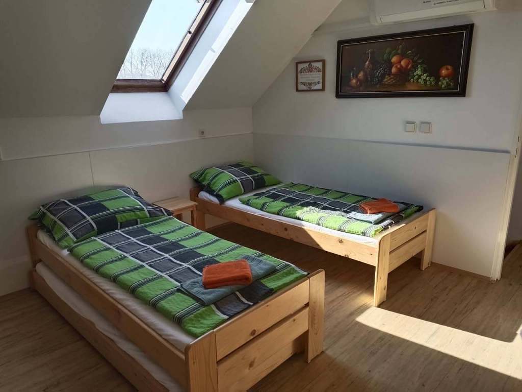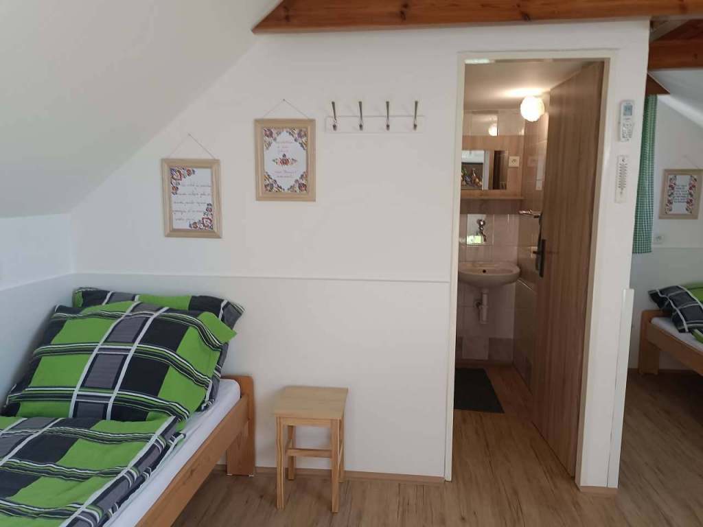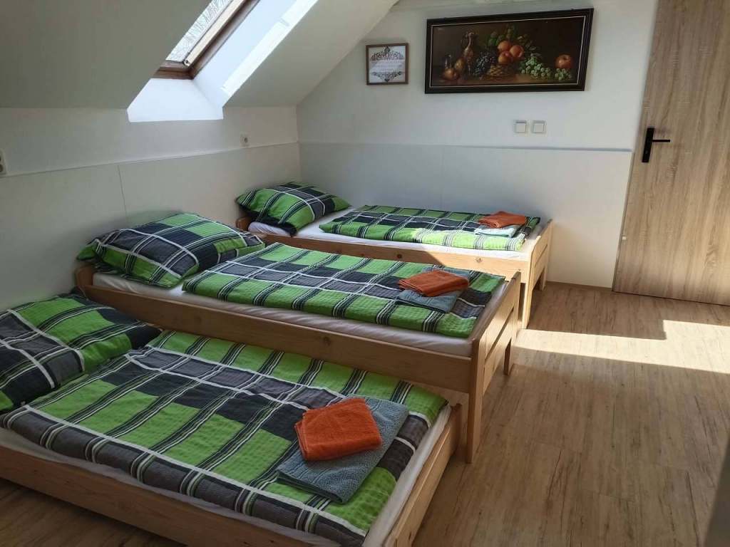 Ložnice je v patře, jedná se o jednu místnost 4 lůžka, 2 přistýlky. ( jedna přistýlka je plnohodnotné lůžko, jedna je přistýlka)