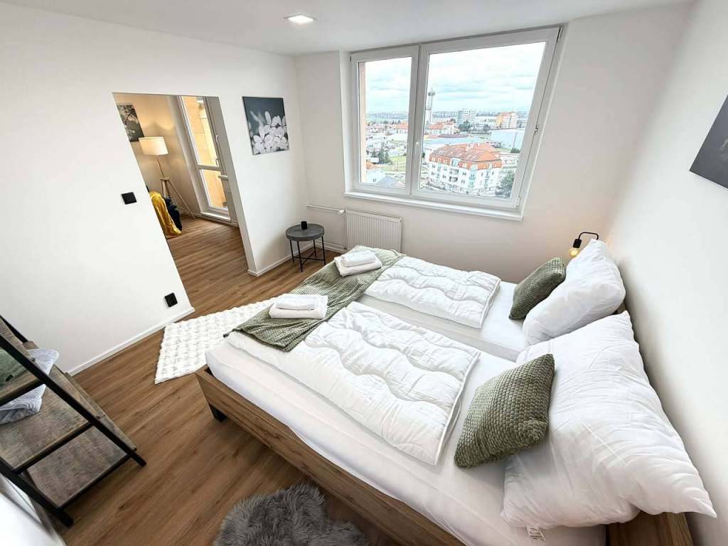 Sky View Apartmán – exkluzivní ubytování s panoramatickým výhledem. Sky View Apartmán se nachází v 10.nadzemním podlaží a nabízí jedinečný panoramatický výhled na město i okolní krajinu. Apartmán prošel v březnu 2026 kompletní a citlivou rekonstrukcí s důrazem na moderní design, komfort a prémiovou atmosféru. Každý detail byl navržen tak, aby hostům poskytl pocit luxusu, klidu a soukromí.