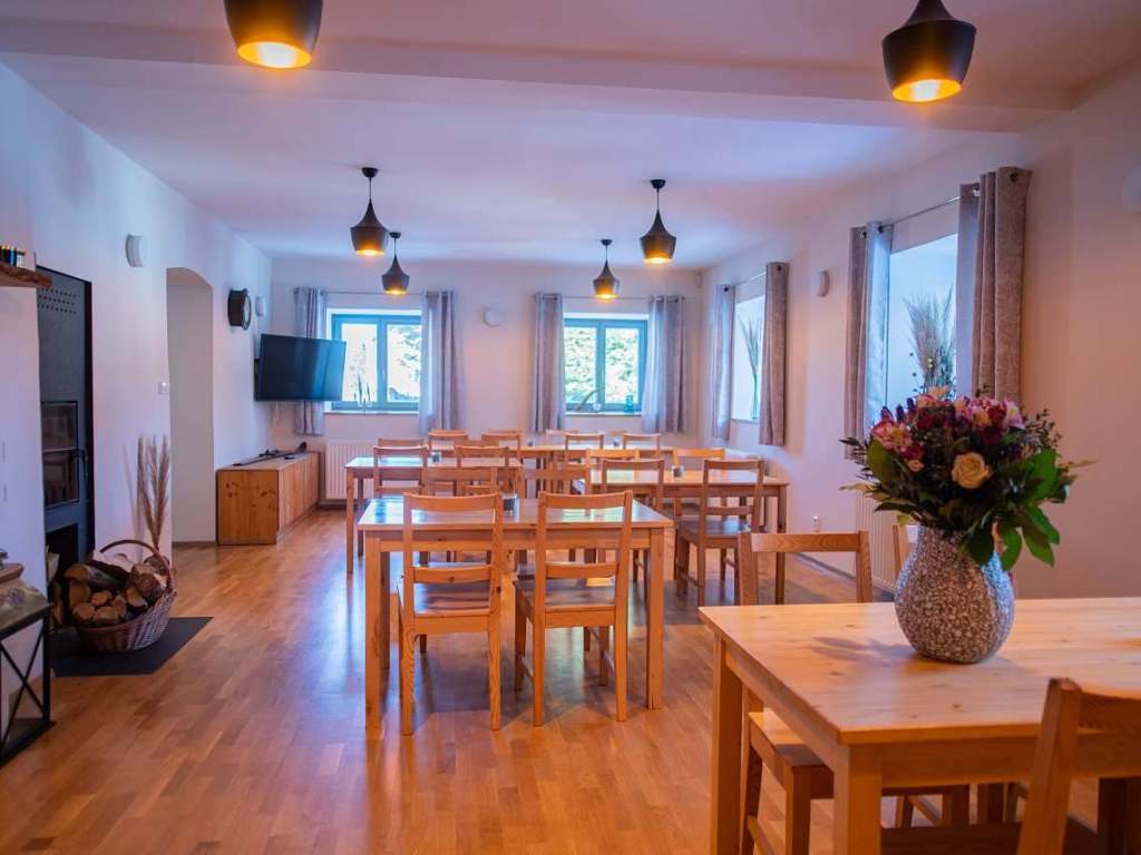 Kompletně vybavená kuchyně, WIFI připojení ZDARMA, salonek s krbem, herna, knihovna, úschovna kol, masáže na objednávku.
