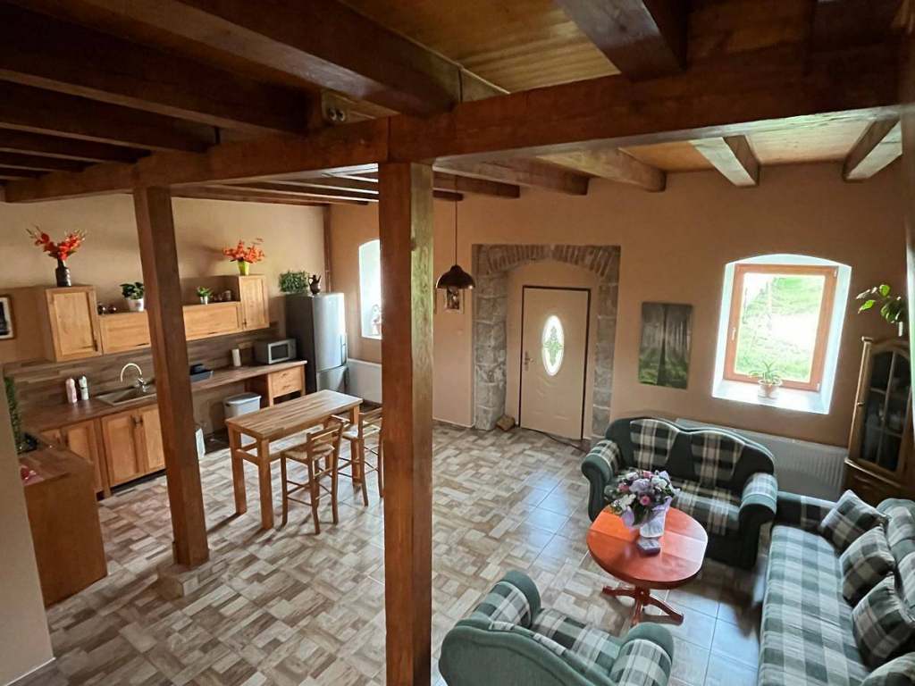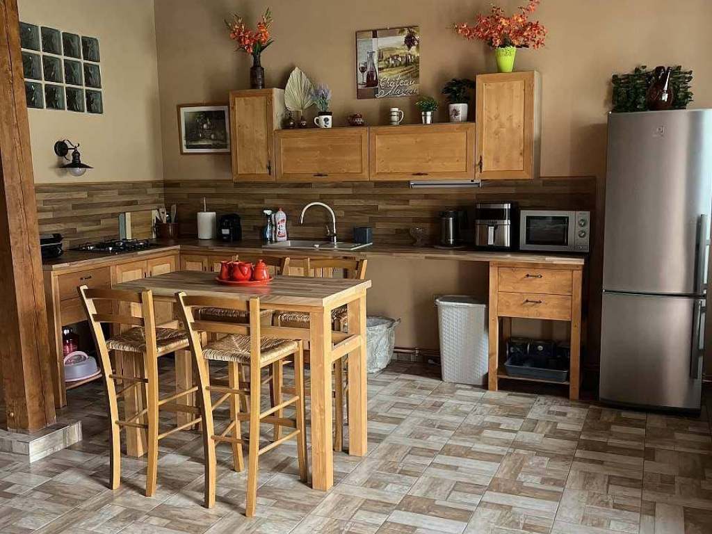 Velký obývací pokoj s pohodlnou sedací soupravou a TV. Plně vybavená kuchyň (lednice, mikrovlnná trouba, varná deska, rychlovarná konvice, nádobí). Jídelní kout pro společné stolování. Wi - Fi připojení zdarma.