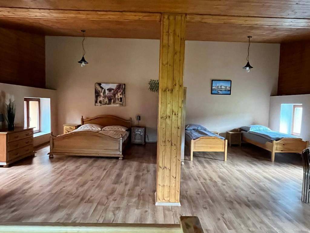 Ubytování pro 4 - 5 osob, jedna velká ložnice v patře opatřena 4 postelemi, ložnice je rozdělena přepážkou. V přízemí je k dispozici pohovka pro pohodlný odpočinek během dne.