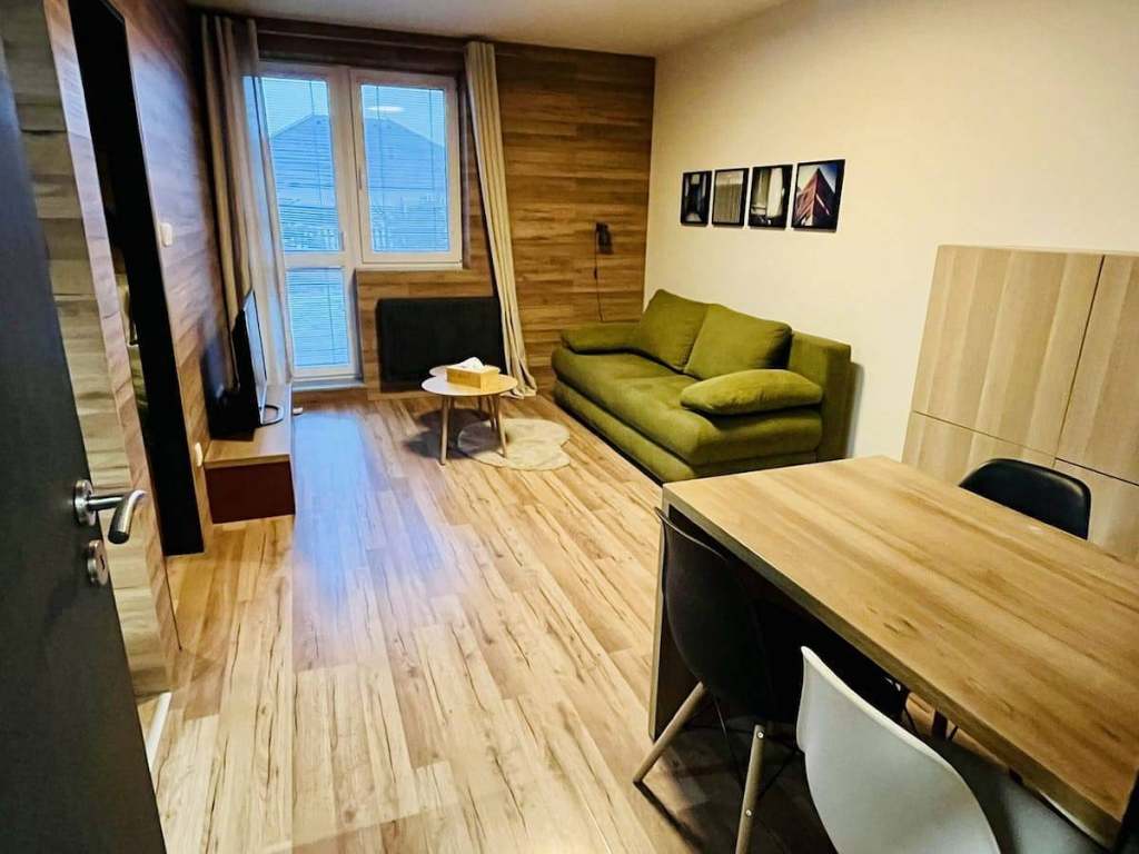 Z obývacího pokoje lze vstoupit přímo na soukromou terasu s dřevěným posezením, která plynule navazuje na zahradu s herními prvky pro děti. Toto uspořádání činí apartmán ideálním místem pro páry hledající klid i pro rodiny, které chtějí mít své děti v bezpečí na dohled při hře na čerstvém vzduchu.