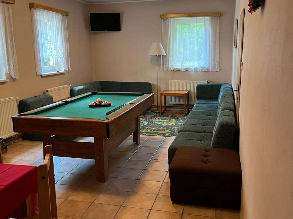 Společenská místnost má větší TV, dětské společenské hry, kulečník - zdarma. Parkování u budovy. WIFI v budově. K dispozici je zahradní gril, venkovní posezení